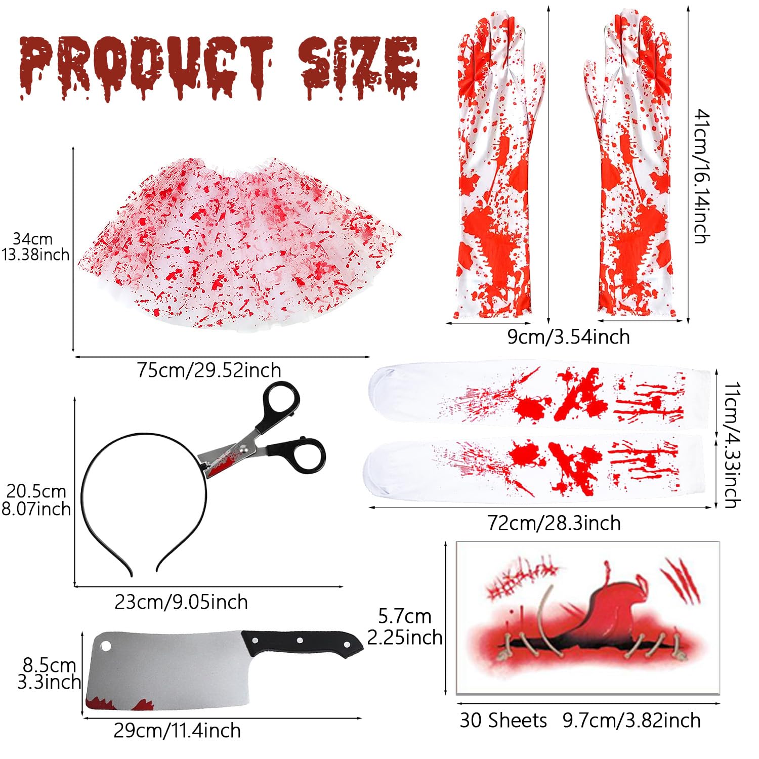 - Set Completo de Disfraz Zombi – Incluye falda tutu de doble capa manchada de sangre, medias sangrientas, guantes largos, diadema con tijeras, machete falso y 30 hojas de tatuajes para un look de terror completo.