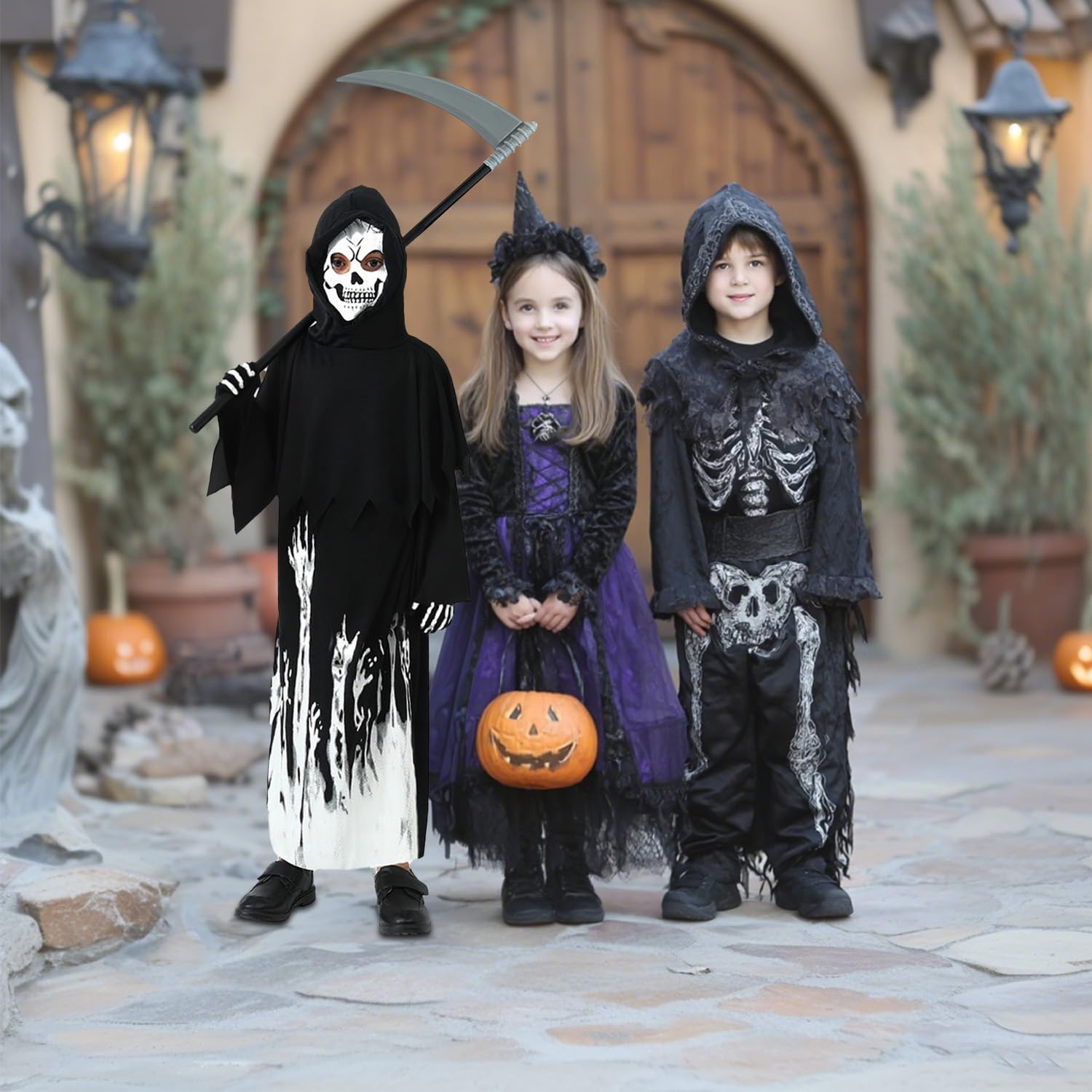 - Set Completo de Disfraz Grim Reaper para Niños – Incluye túnica negra, máscara de calavera con capucha, guadaña de plástico y guantes de esqueleto que brillan en la oscuridad, todo para un look realista y aterrador.
