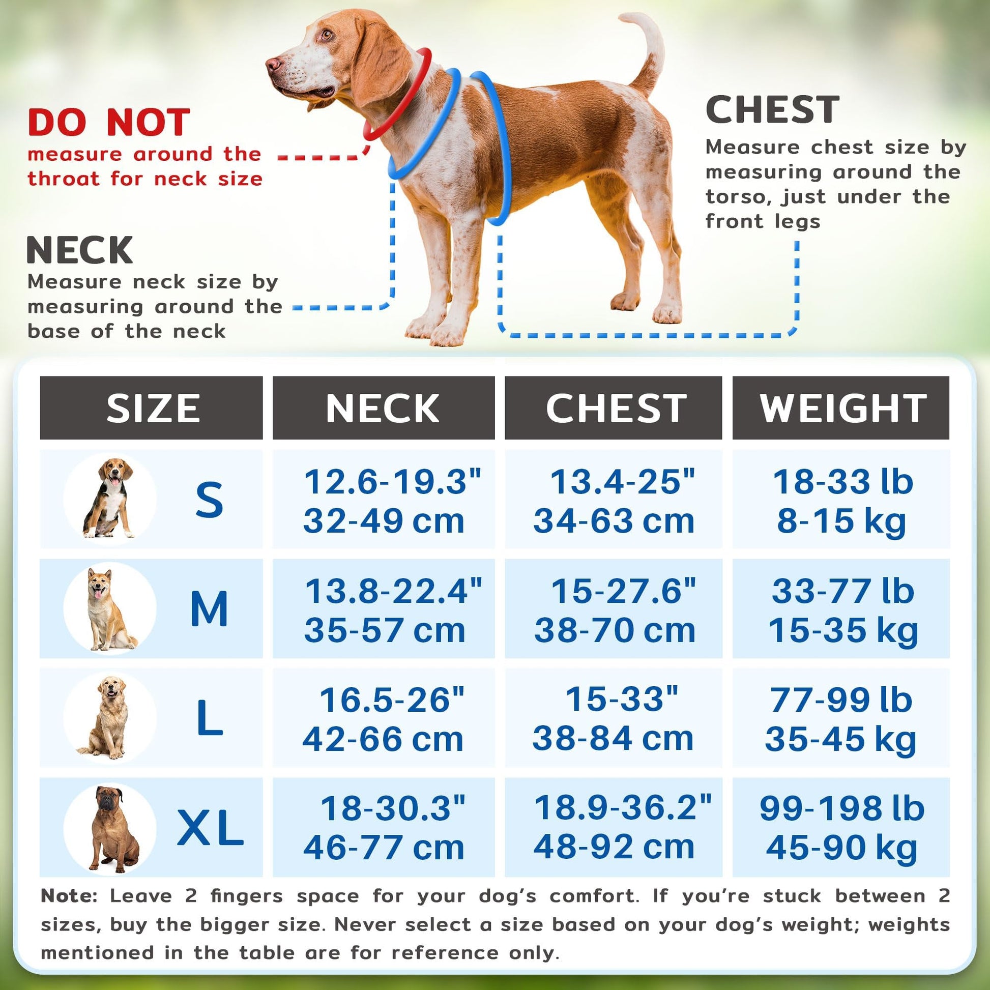 - MIDE A TU PERRO - Diseñado para adaptarse a perros extra grandes con tallas de pecho que van desde 48 cm - 98 cm (18,9" - 38,6") y circunferencia de cuello que va desde 52 cm - 85 cm (20,5" - 33,5"); Debes consultar nuestra tabla de tallas y siempre medir el pecho y la circunferencia del cuello de tu mascota antes de seleccionar la talla.