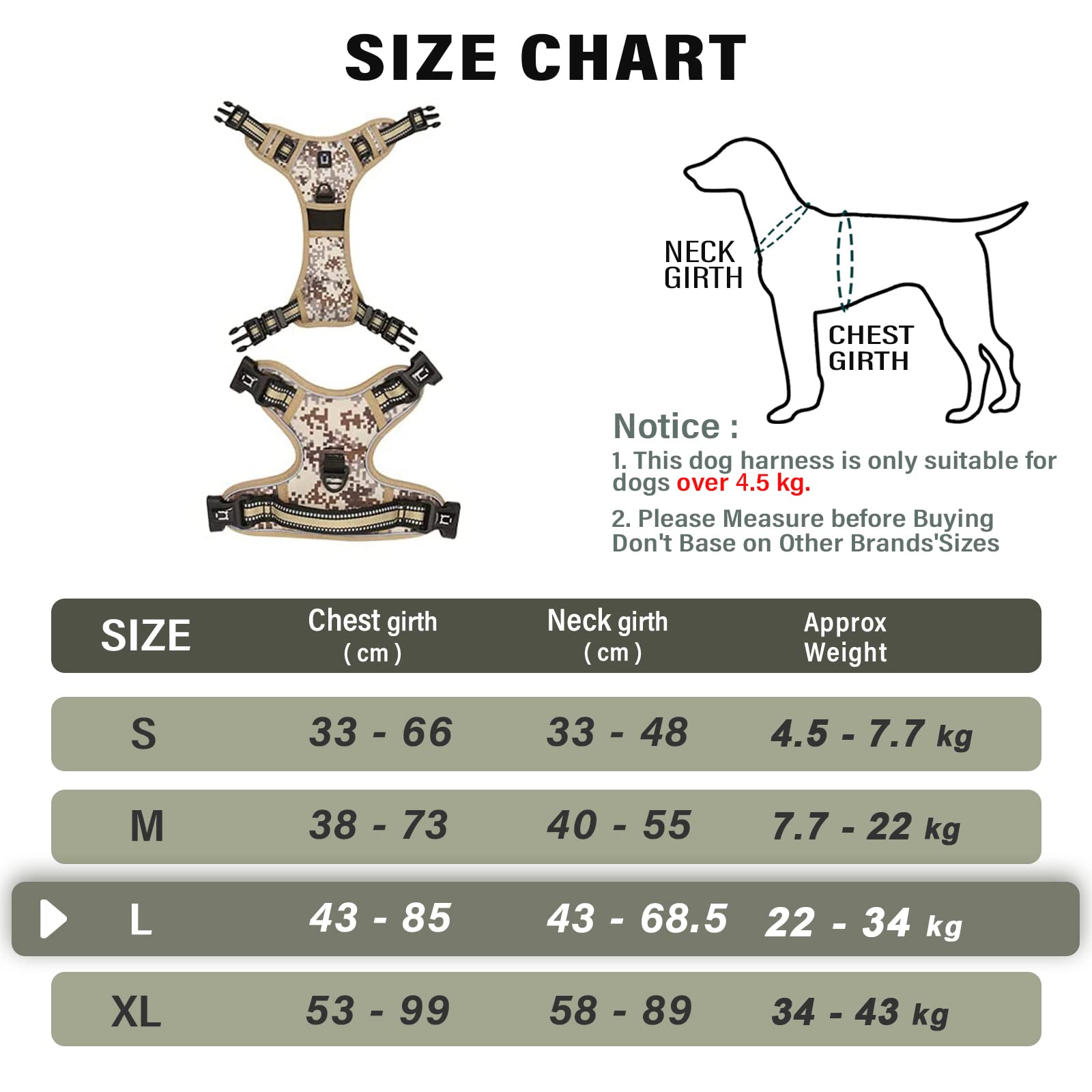 - Confirmación de talla - Talla L: Circunferencia del cuello: 43-68.5 cm, Circunferencia del pecho: 43-85 cm. Nota: Mida el cuello y el pecho de su perro en cualquier punto que tenga la circunferencia más ancha del pecho. Puede necesitar agregar 2-3 cm. Es mejor seleccionar un tamaño más grande si su perro está creciendo.