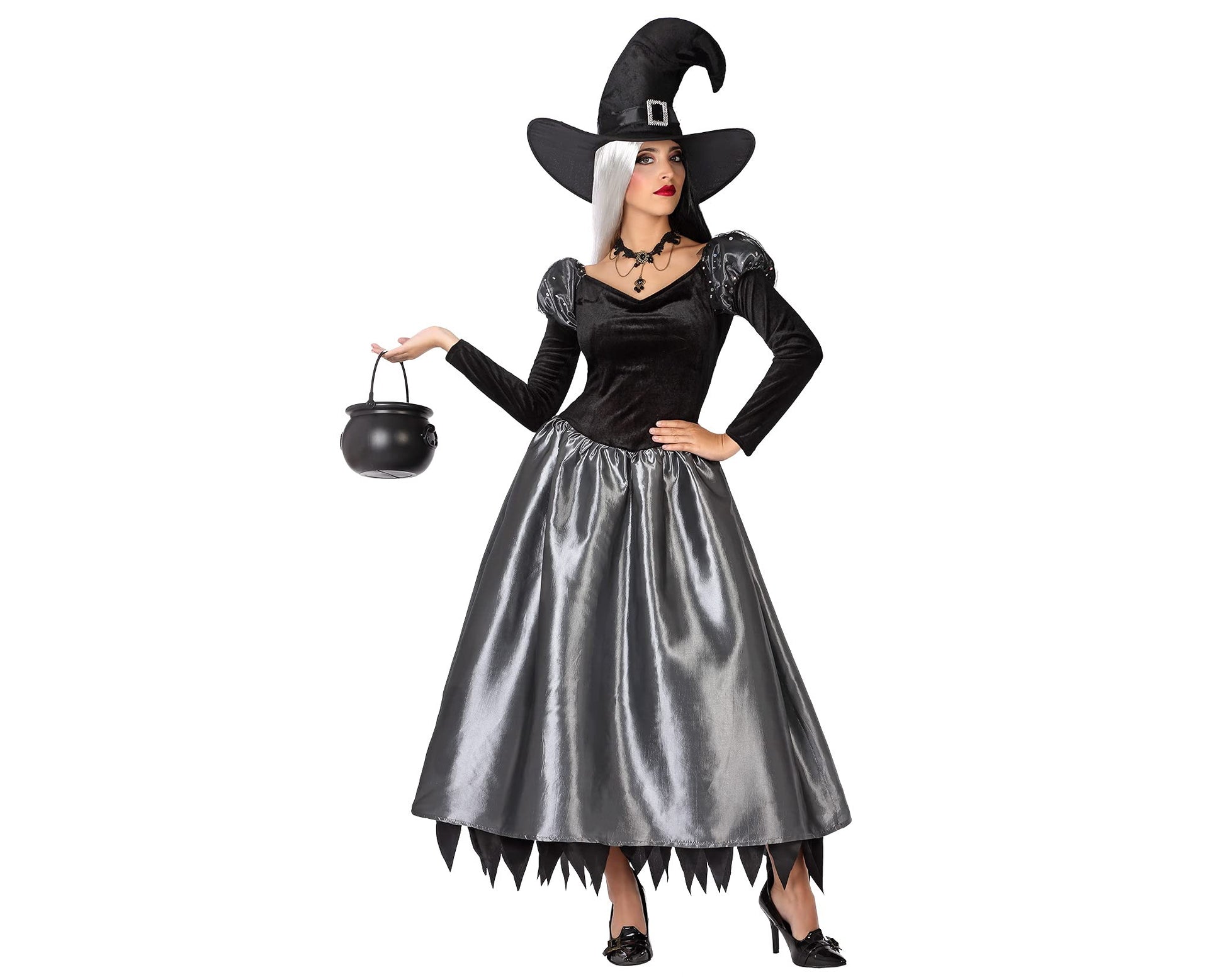 - El conjunto de bruja de mujer se compone de 2 piezas: un sombrero aterciopelado negro, alto, retorcido y el vestido. El vestido tiene el diseño aterciopelado y ajustado en la parte superior con hombreras abombadas y un cuello ancho apuntado. La falda es gris lisa con efecto charol brillante. Culmina con un tejido liso en el inferior con formas irregulares y rotas.