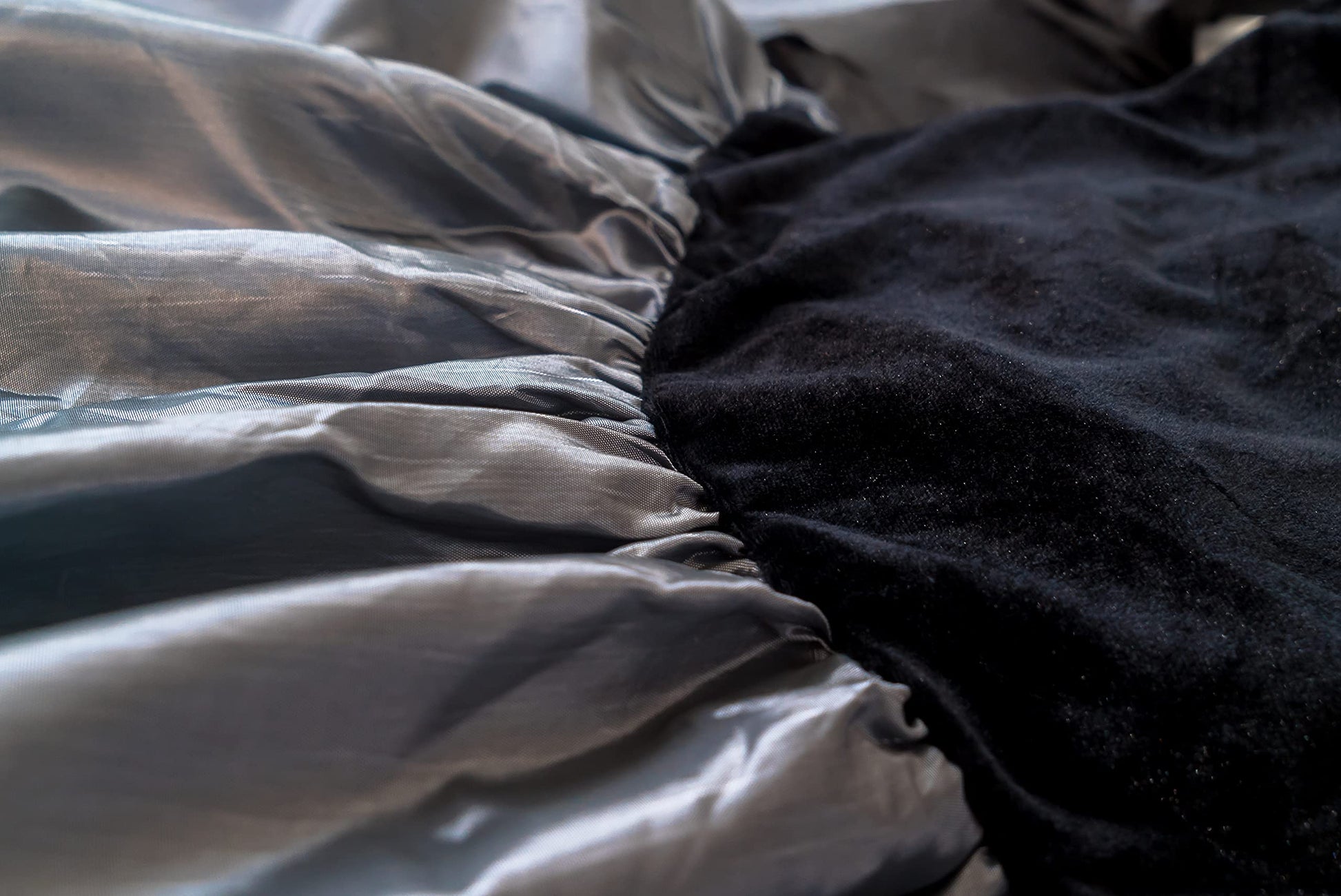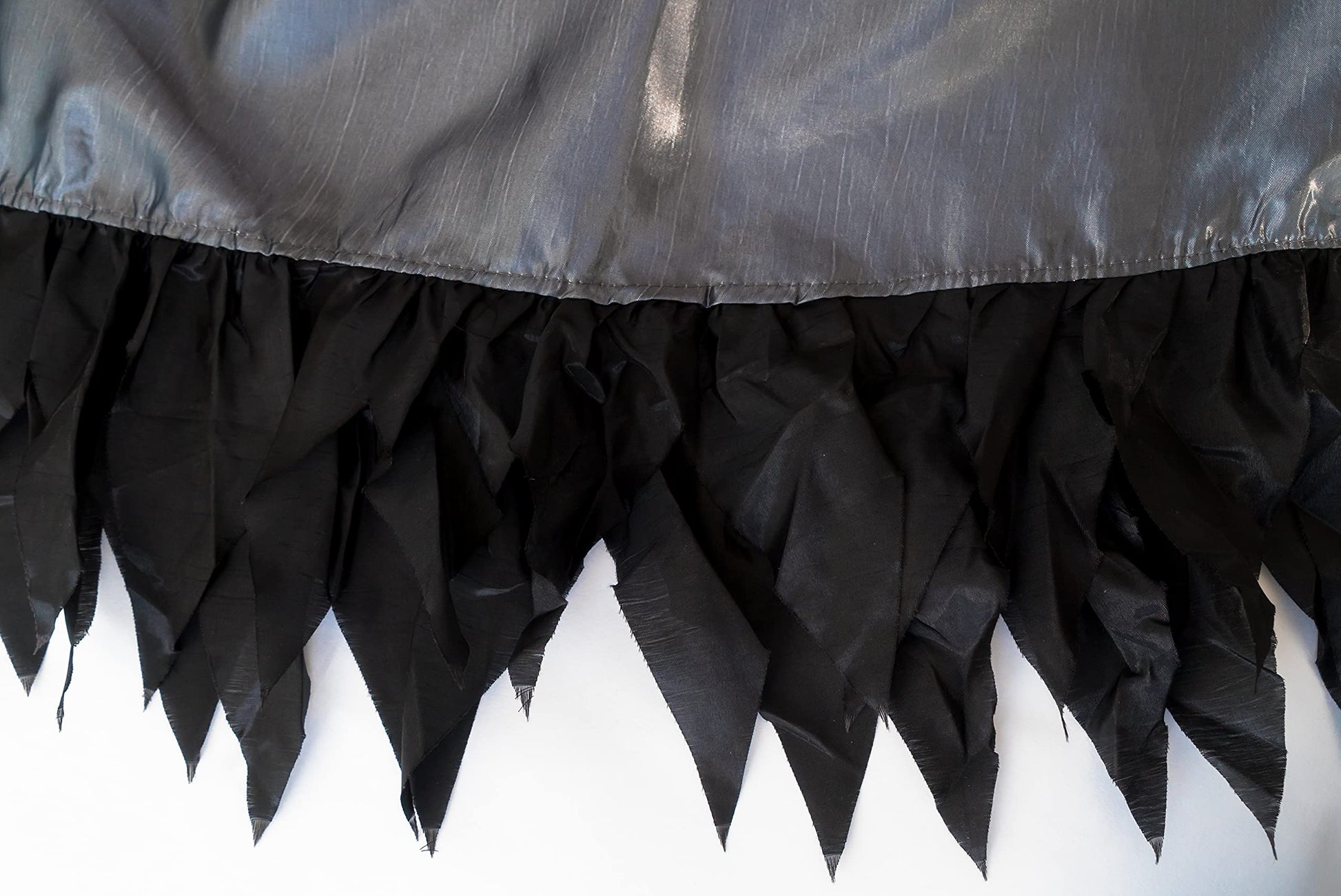 El escote trasero incluye un elástico para que se ajuste bien a su morfología las mangas largas están en los hombros de satén plateado cubierto con un velo negro con lentejuelas La parte baja está hecha de tela satinada plateada, y acabado con 2 volantes de satén negro formando puntas 1 SOMBRERO puntiagudo: de terciopelo negro, con una cinta ancha de satén negro en su base y decorada con una hebilla de plástico plateado.