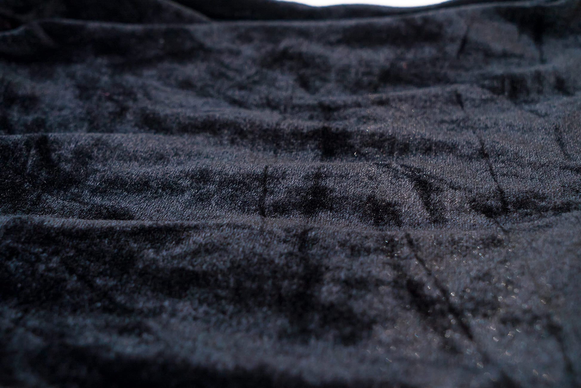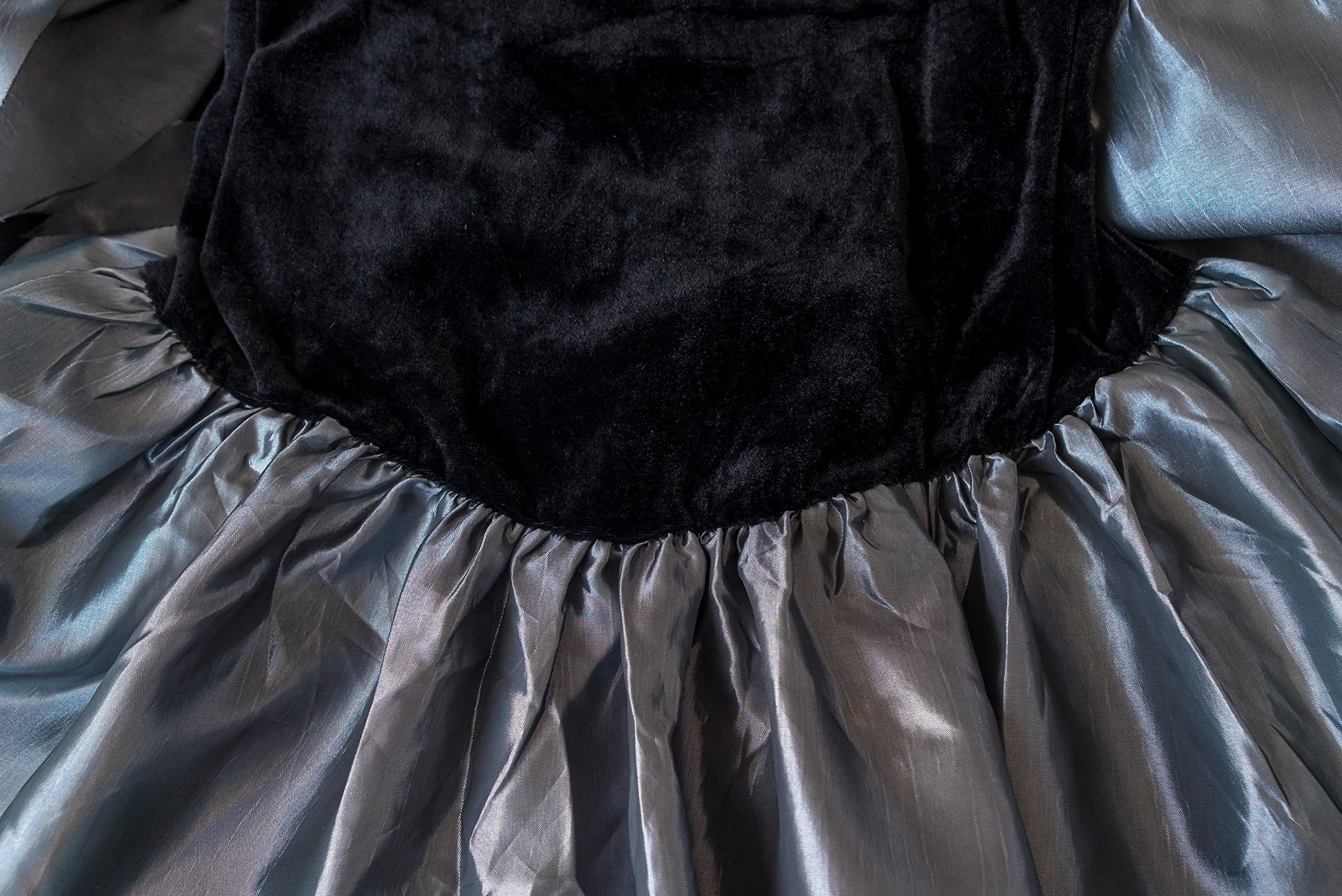 - Los tejidos del vestido son de gran calidad con diferentes confecciones y texturas. Las hombreras tienen unos originales decorados brillantes con una superposición semitransparente. El corpiño es negro aterciopelado y la falda es brillante con una tela más lisa.
