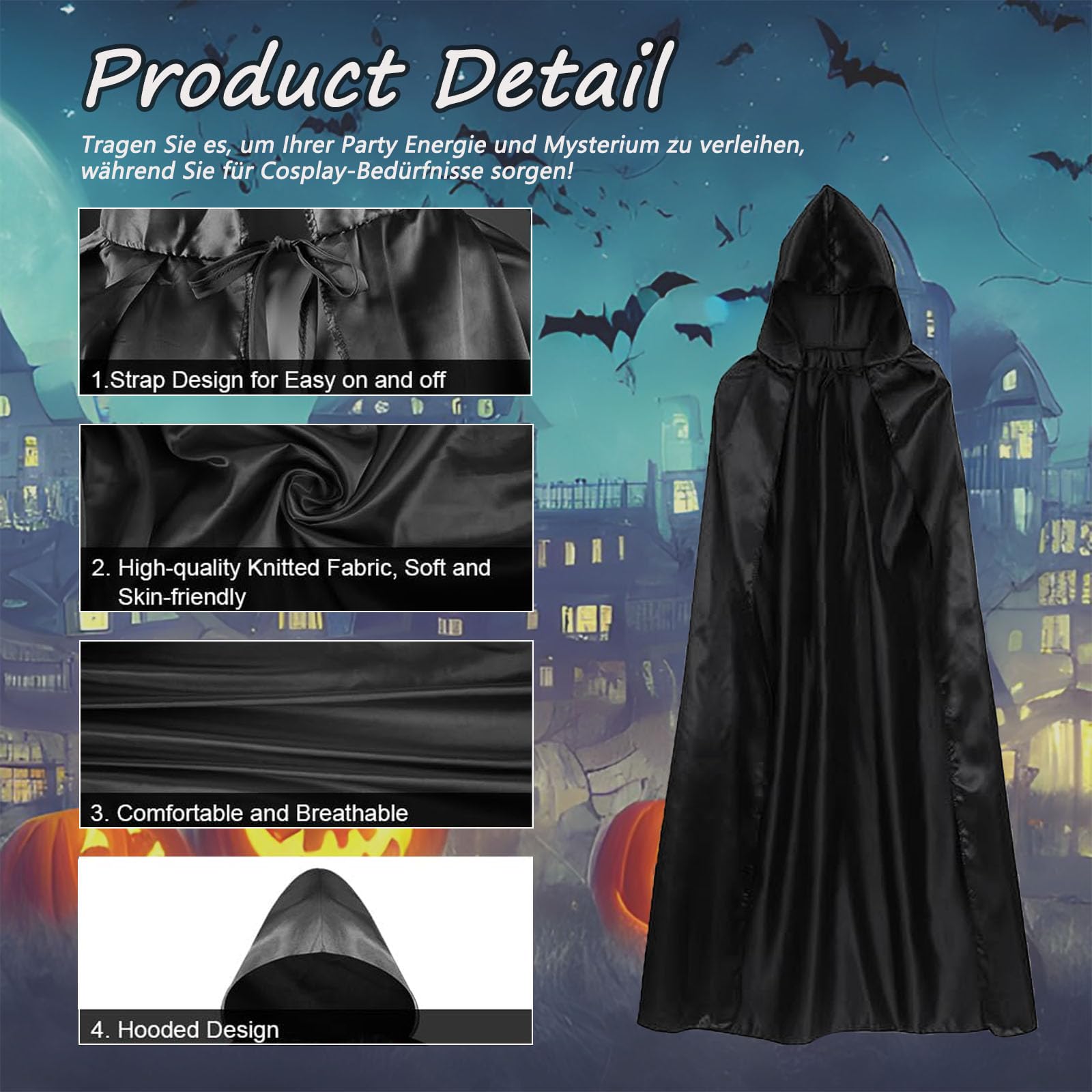 - 【Diseño de un solo lado】 Esta Capa Negra Disfraz de Bruja está diseñada con una sola capa, el color es negro clásico,Il design elegante, l'ampio cappuccio e il colletto garantiscono un maggiore comfort a chi lo indossa, consentendo allo stesso tempo di giocare di ruolo e di rendere la festa divertente e di stupire gli ospiti.