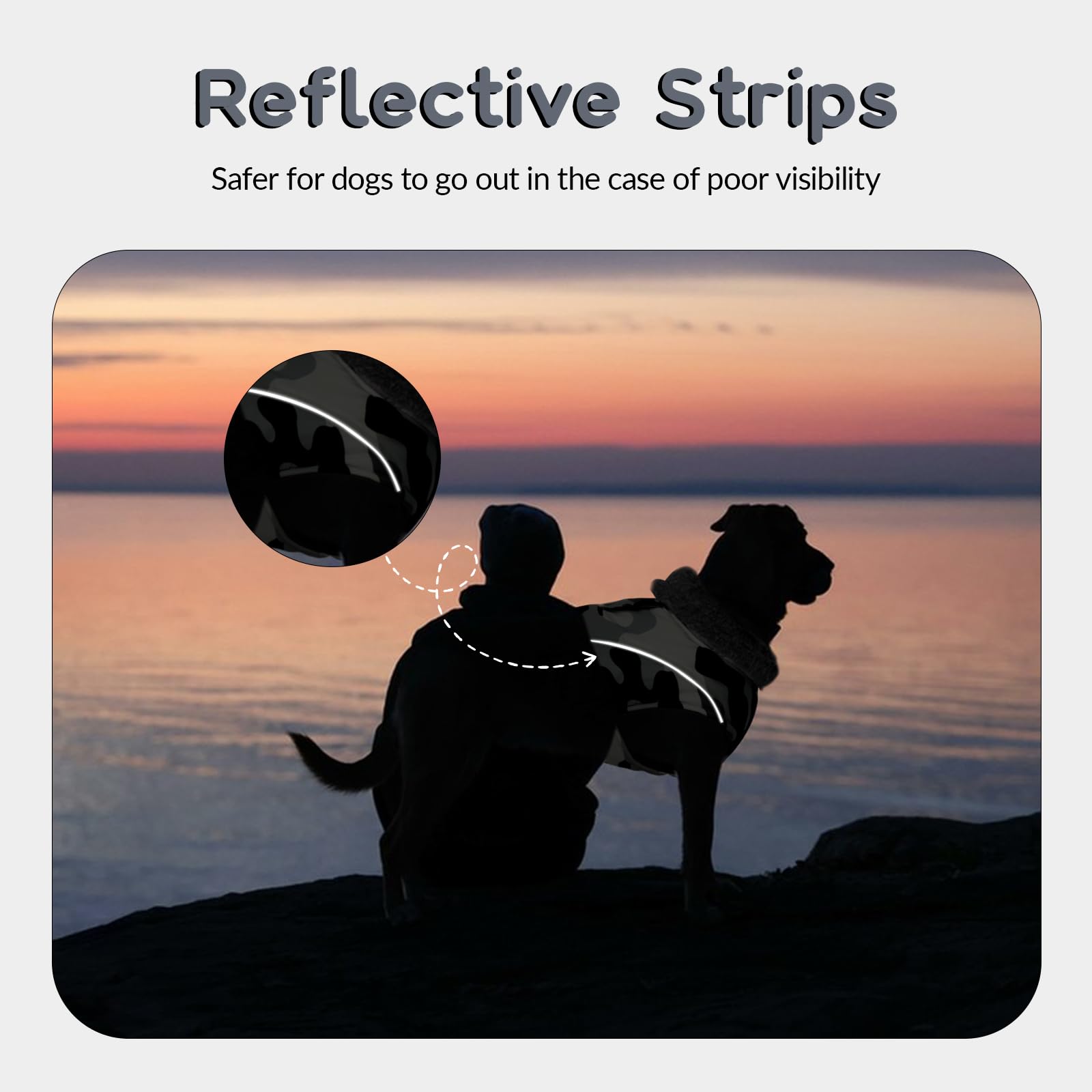 - 【REFLECTANTE Y AGUJERO PARA CORREA】El abrigo para perros con orificio para arnés cosido con rayas reflectantes, hace que su perro sea más visible y seguro por la noche. Y hay un orificio oculto para correa en la parte posterior, que es muy conveniente para usar el collar o arnés dentro de la chaqueta impermeable para perros.