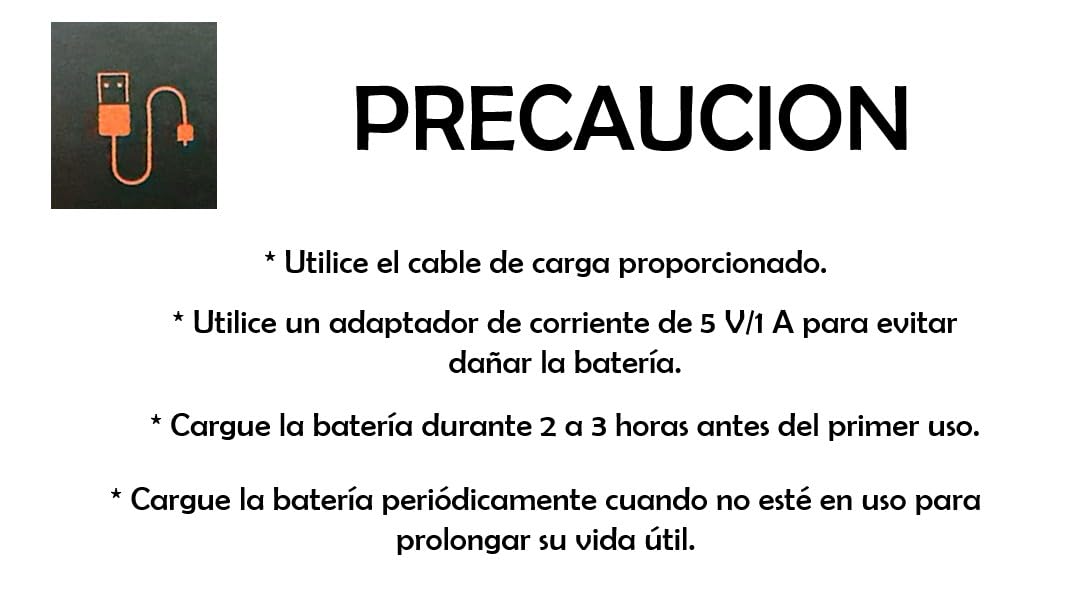 - 🔌【PRECAUCION】Utilice el cable de carga proporcionado. Utilice un adaptador de corriente de 5 V/1 A para evitar dañar la batería. Cargue la batería durante 2 a 3 horas antes del primer uso. Cargue la batería periódicamente cuando no esté en uso para prolongar su vida útil.
