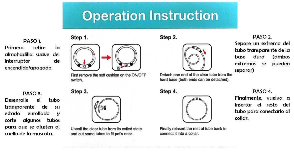 - 🔆【INSTRUCCIONES DE MONTADO】 PASO 1. Primero retire la almohadilla suave del interruptor de encendido/apagado. PASO 2. Separe un extremo del tubo transparente de la base dura (ambos extremos se pueden separar) PASO 3. Desenrolle el tubo transparente de su estado enrollado y corte algunos tubos para que se ajusten al cuello de la mascota. PASO 4. Finalmente, vuelva a insertar el resto del tubo para conectarlo al collar.