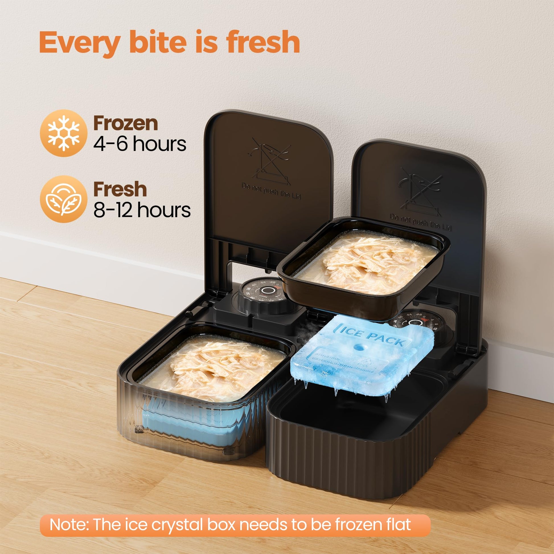 - Manténgalo fresco: Comedero automatico se usa con bolsas de hielo, puede mantener los alimentos frescos hasta por 8-12 horas y congelar los alimentos húmedos por 4-6 horas. Di adiós a la comida en mal estado y deja que tu mascota coma alimentos frescos, deliciosos y nutritivos incluso en los días calurosos