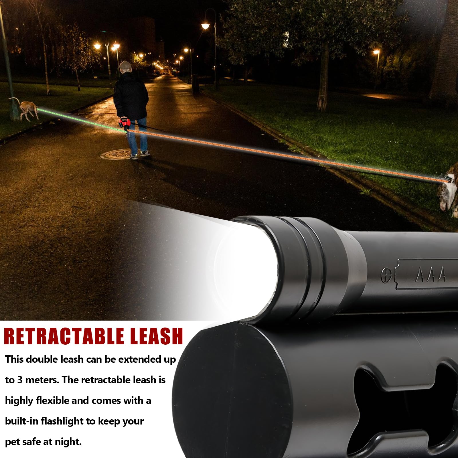 - Retractable Dog Lead: esta correa doble para perros se extiende hasta 3 metros. La correa retráctil para perros ofrece una gran flexibilidad y está equipada con una lámpara de mano incorporada para garantizar la seguridad de su mascota por la noche.