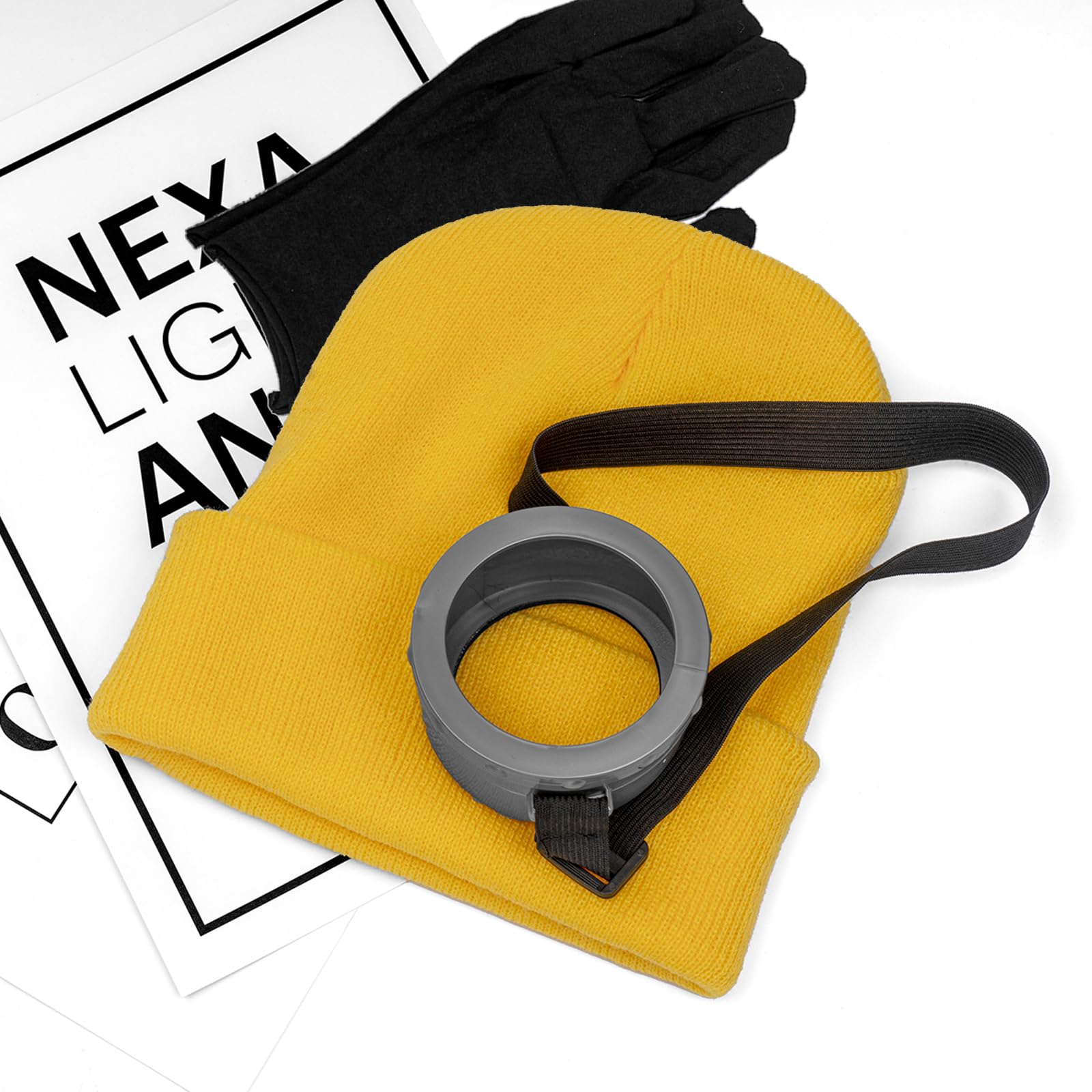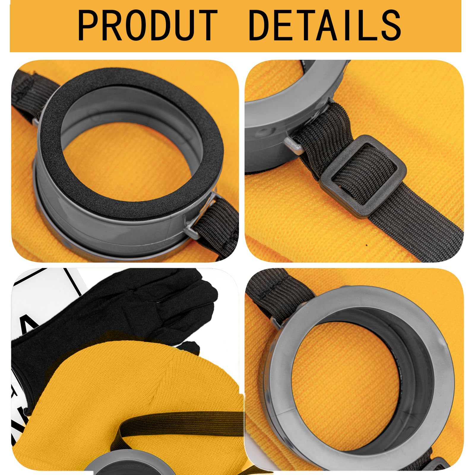 - El gorro amarillo y los goves negros están hechos de poliéster y son elásticos para adaptarse a la mayoría de tamaños de cabeza y mano.