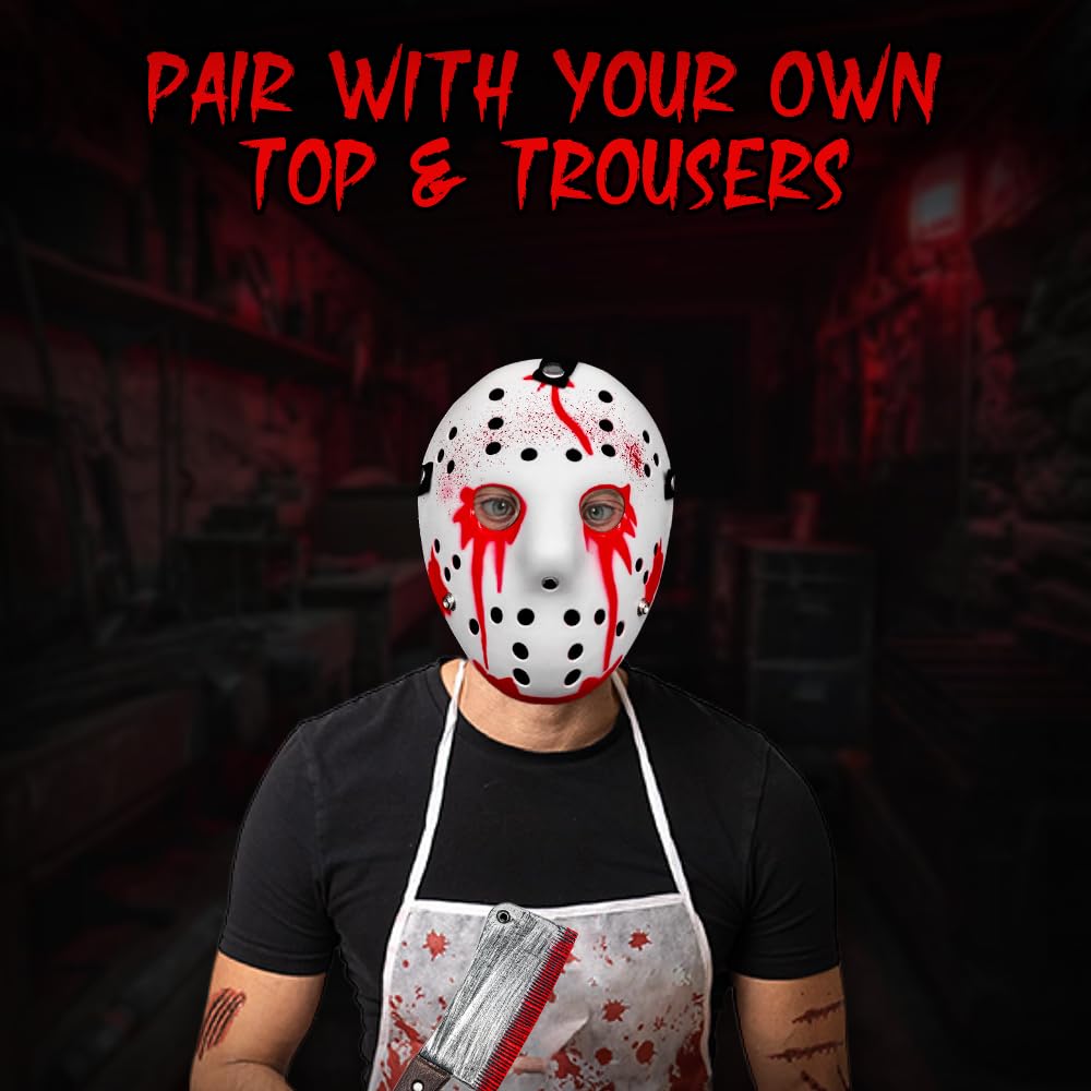 - 【Tamaño Ideal】Delantal sangriento de 70x50cm, diseñado con cuello y correa, fácil de usar y quitar. Máscara de terror 24x19 cm, adecuada para la mayoría de las personas, independientemente de la edad y el sexo. La longitud del cuchillo sangriento es de 30 centímetros.