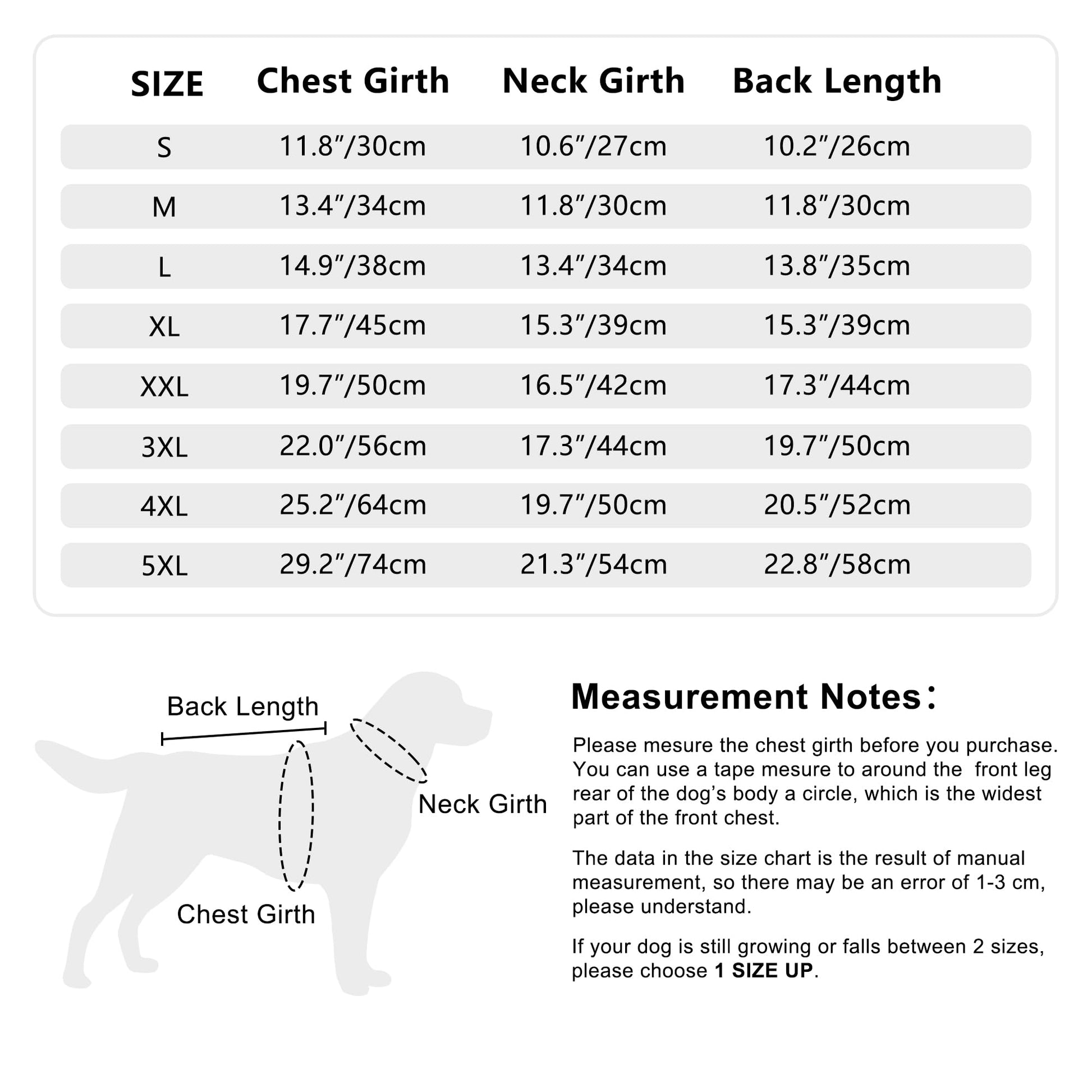 - Atención: la talla de la ropa para perros no es universal. Le recomendamos que mida la circunferencia del pecho y el cuello de su perro antes de la compra. Si su perro está creciendo o tiene un pelaje espeso, por favor, coja una talla más.