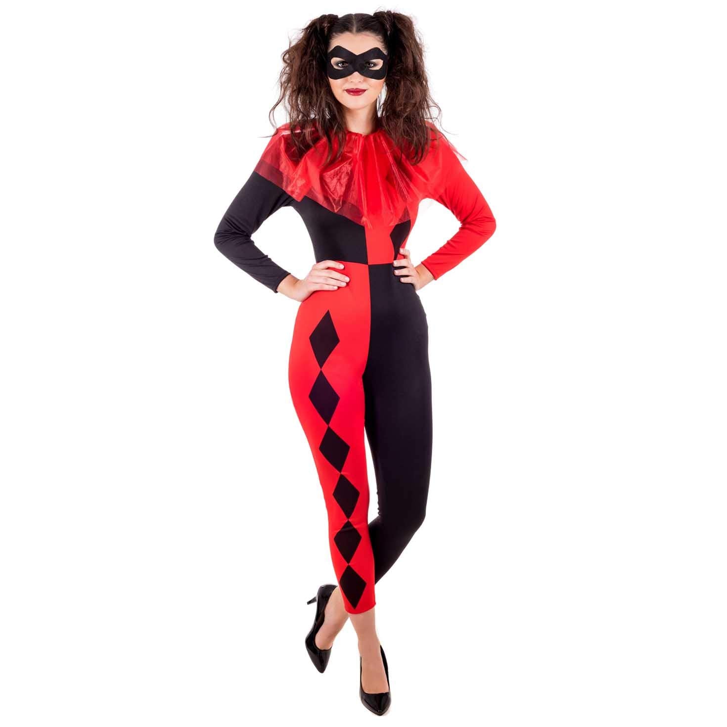 - Disfraz Arlequin Mujer Incluye: Mono de cuerpo entero negro y rojo decorado con rombos, volante rojo en el huello y antifaz negro.