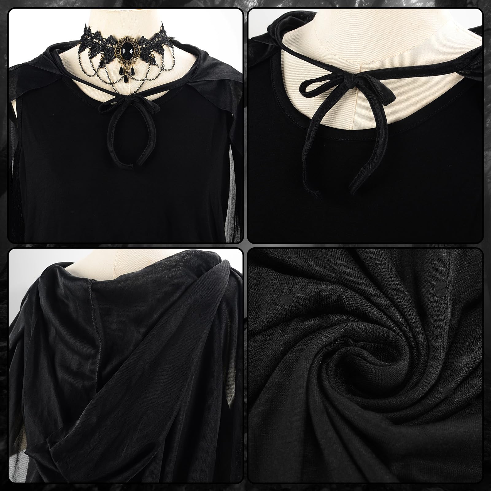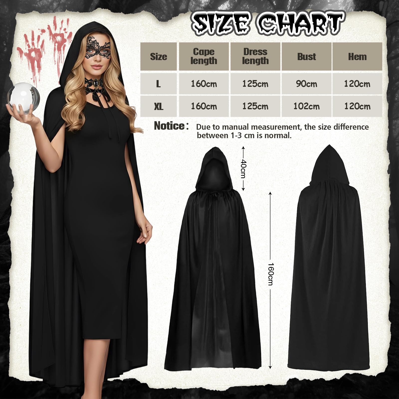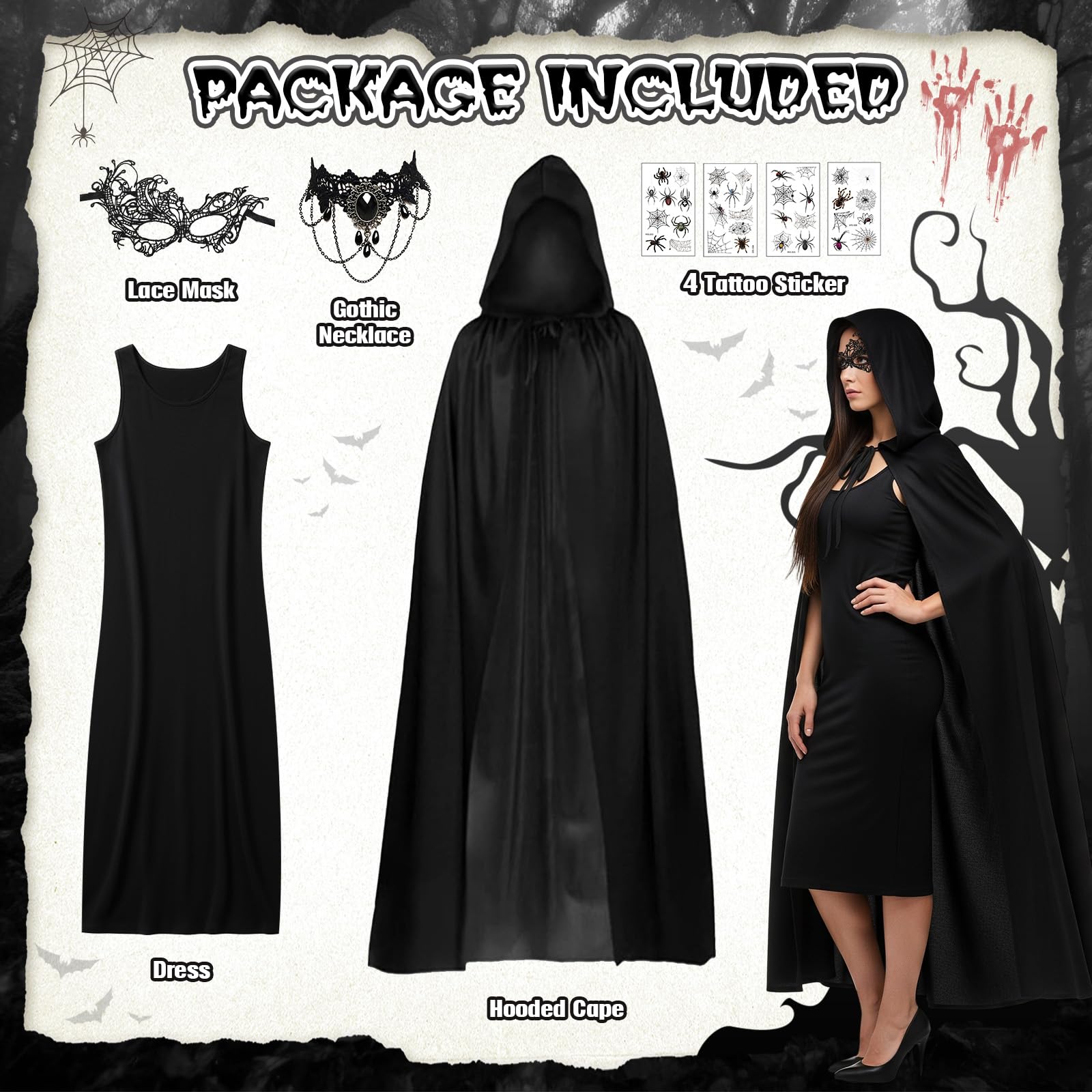 - 【Conjunto de Disfraz de Bruja Negro Capa todo en uno】El paquete incluye: 1 Halloween capa de bruja negra con capucha, 1 vestido negro (talla L o XL), 1 collar de encaje, 1 máscara de encaje y 4 pegatinas de tatuajes de araña. Este disfraz de bruja con capa de vampiro para Halloween para mujer es perfecto para disfrazarte de bruja, vampiro o novia fantasma para una fiesta de cosplay.