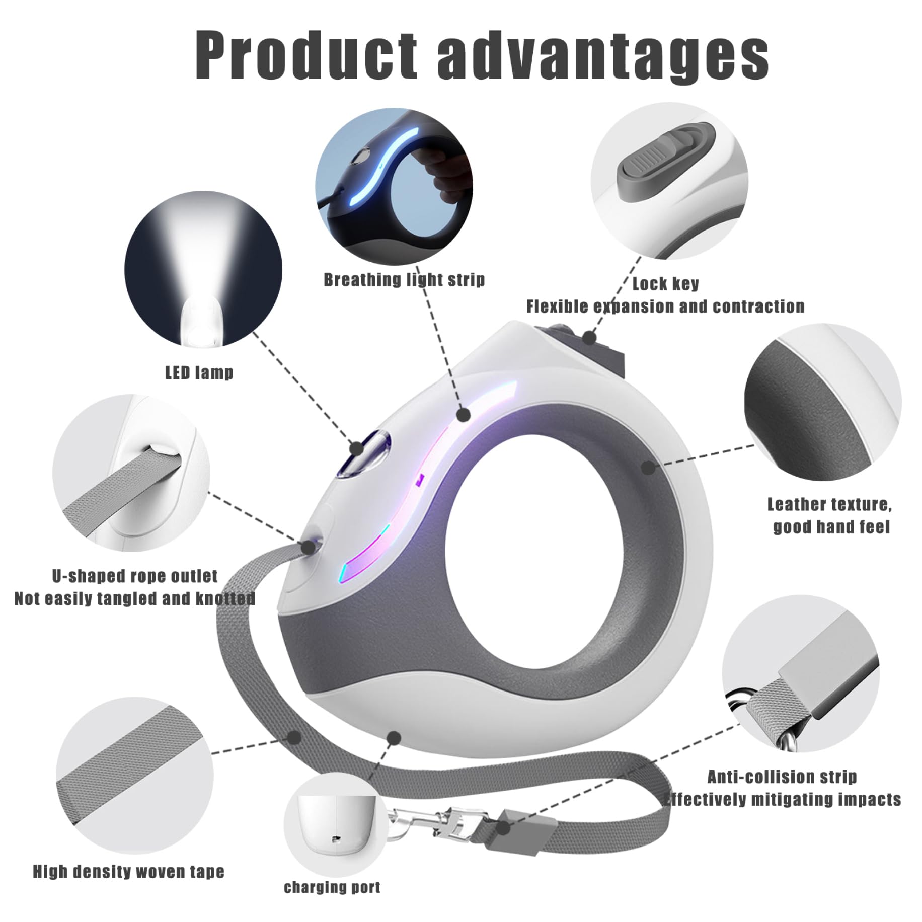 La correa para perros retráctil es una correa versátil y flexible que se extiende hasta aproximadamente 300 cm/118.11 pulgadas de longitud..Cuenta con un mecanismo de bloqueo de un botón que le permite bloquear rápidamente y desbloquear la correa, dándole a su perro la libertad de moverse mientras los mantiene a salvo de los peligros potenciales..La correa está diseñada con luces LED frías que proporcionan iluminación durante las caminatas nocturnas, lo que lo hace más seguro para usted y su perro..El diseño del mango circular con dimensiones de aproximadamente 13.5x16.5cm/5.31x6.50 pulgadas se puede usar de dos maneras, ya sea sosteniéndolo en la mano o colocándola en la muñeca, liberando las manos para otras actividades..La correa está alimentada por una batería interna que se puede cargar utilizando una interfaz tipo C, proporcionando una potencia de larga duración..Hecho de materiales de calidad, que incluye un mango PP, forro de mango de cuero y correa trenzada de alta densidad, la correa de perros retráctil es duradera, cómoda y resistente al desgaste..Elija la correa para perros retráctil para mantener a su amigo peludo seguro y elegante durante las caminatas..