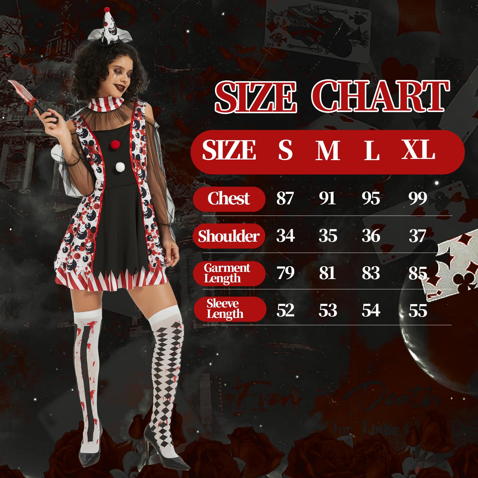 - 📏[Selección de Tallas] El disfraz de payaso terrorífico para mujer se adapta a la mayoría de las personas y está disponible en las tallas M y XL. Puedes elegir una talla basándote en las medidas que aparecen en la imagen para asegurarte de que el disfraz te queda bien. Nuestra diadema con sombrero se lleva directamente en la cabeza, no se cae fácilmente y es cómoda de llevar. Los calcetines a rayas blancas y negras miden 51 cm de largo y añaden un detalle adicional al disfraz.