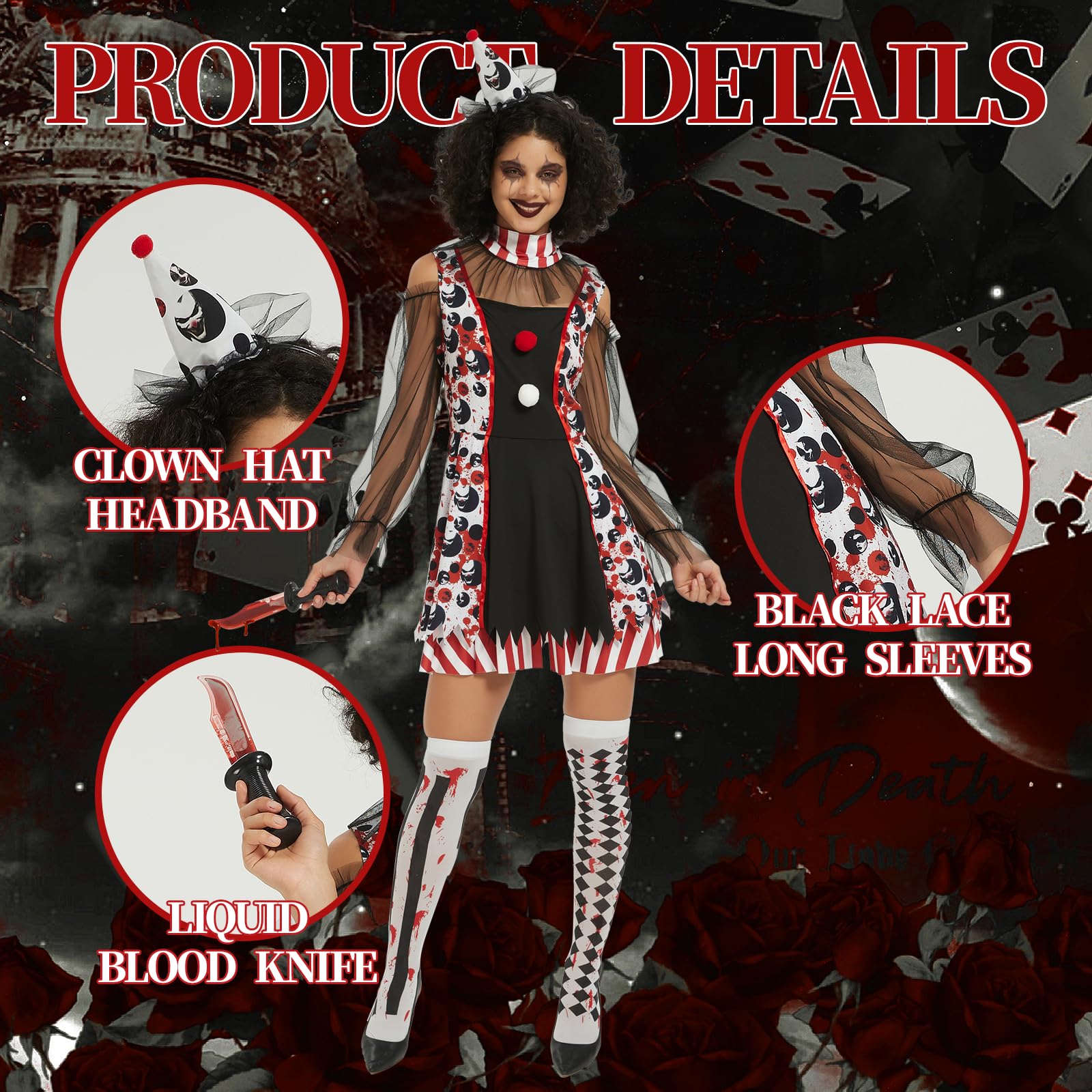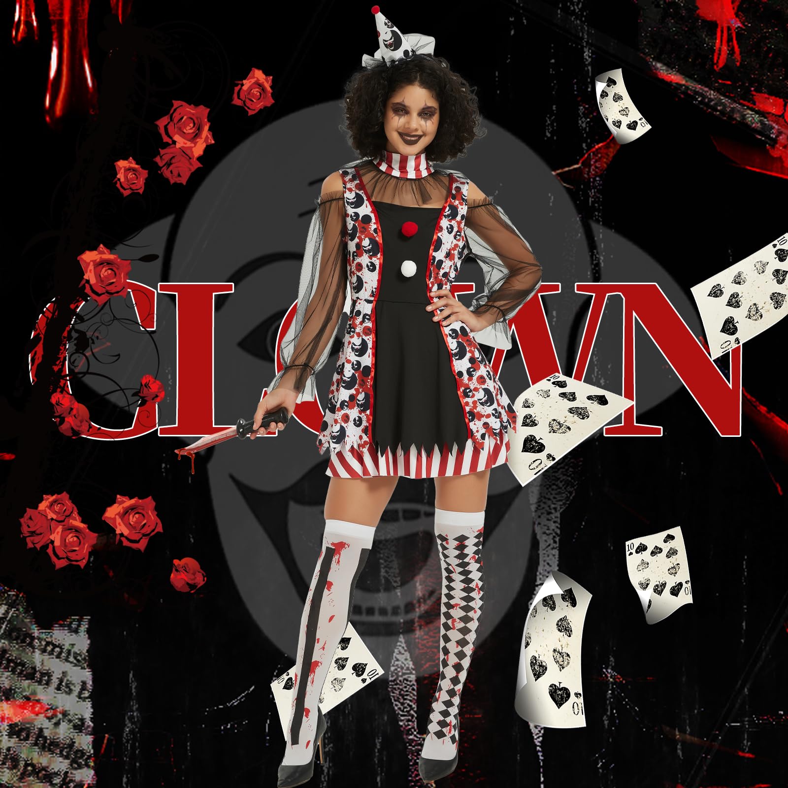 - 🤡[Disfraz de Payaso Terrorífico] Nuestro disfraz de payaso terrorífico para mujer está disponible en dos versiones: por un lado, como conjunto de dos piezas con falda con tirantes, compuesto por top, falda, tirantes, sombrero, pasador para el pelo, medias y globo rojo de payaso; y como vestido, compuesto por falda, medias, pañuelo, sombrero, diadema y cuchillo con sangre falsa. ¡Elige entre las dos versiones y sorprende y grita con tu disfraz de Halloween!