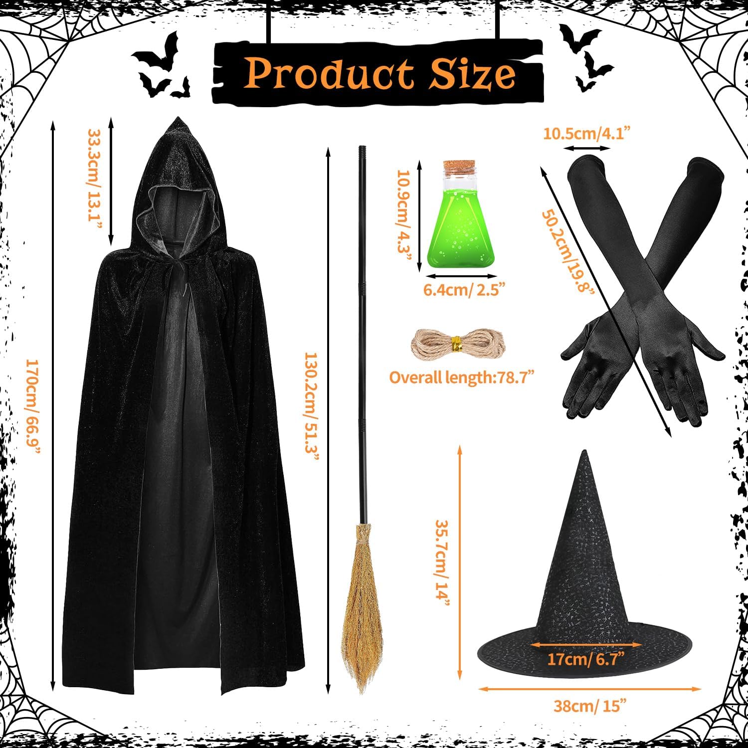 Halloween Disfraz Mujer Sombrero De Bruja Capa 170 cm Escoba Guantes Bruja Para Botella Poción Halloween Disfraz Fiesta Temática Disfraces Diablo Mujer