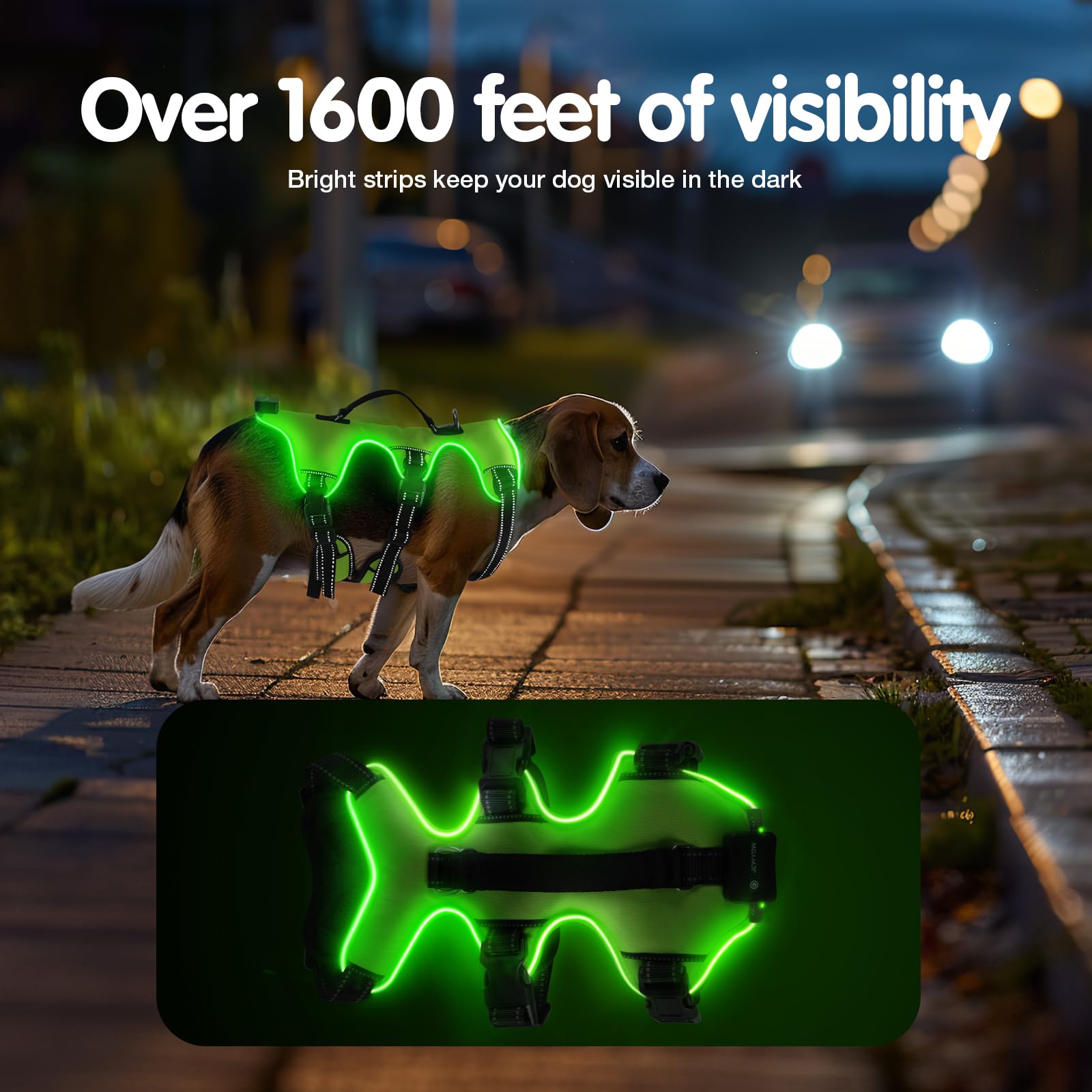Arnés Recargable para Perro Iluminado, Arnés de 3 Puntos para Perros Medianos y Grandes, Recargable con 4 Correas Ajustables, 3 Modos, Impermeable para Caminar por la Noche, Lluvia, Verde-L