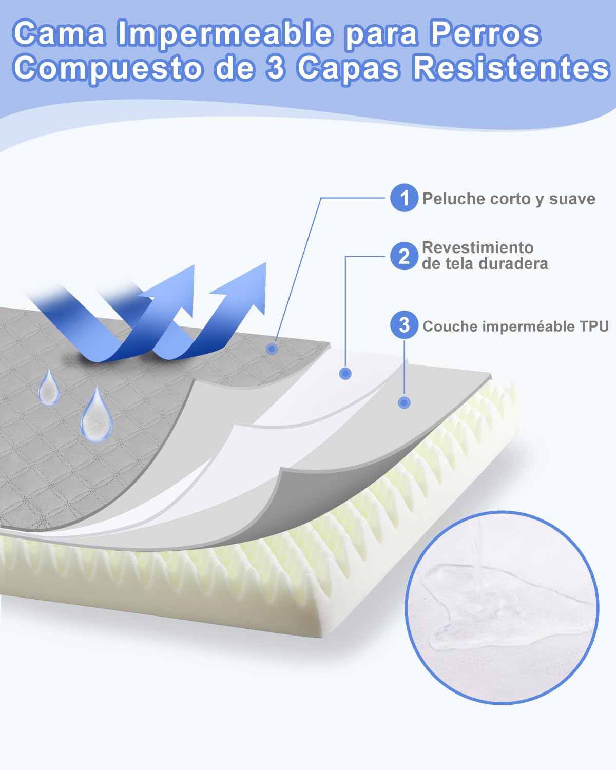 - TPU Impermeable:Estructura innovadora de 3 capas (superficie de felpa holandesa + capa compuesta resistente + membrana TPU impermeable). Bloquea eficazmente líquidos como orina y humedad, manteniendo el interior higiénico y seco, preservando las propiedades de soporte de la espuma viscoelástica.