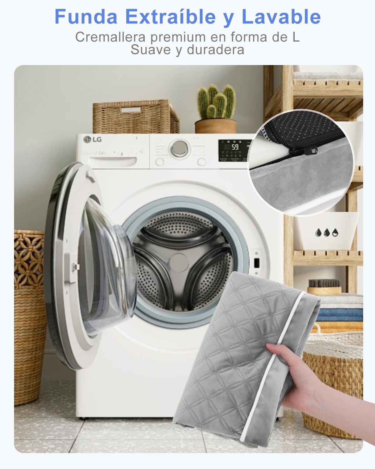 - Funda Extraíble y Lavable:Superficie de felpa corta resistente a manchas. La funda extraíble es lavable a máquina (máx. 40°C) para mantener la frescura e higiene. Importante: No lavar el relleno de espuma.