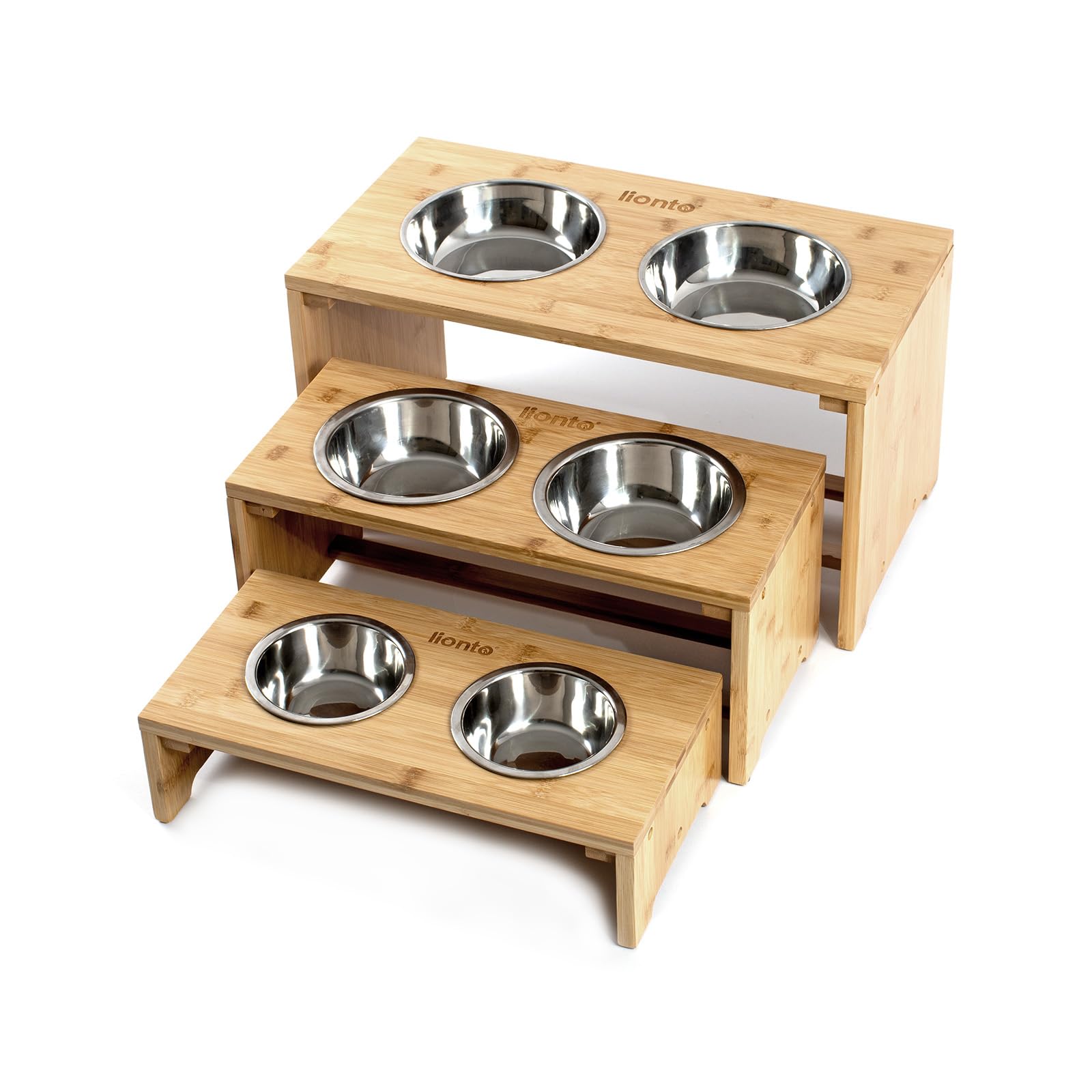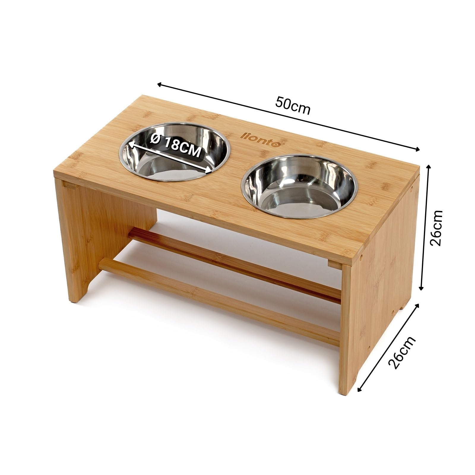lionto Comedero para Perros Elevado comedero para Perros Barra de Comida de bambú para Mascotas 2 Cuencos de Acero Inoxidable Antideslizante, (L) 50x26x26 cm