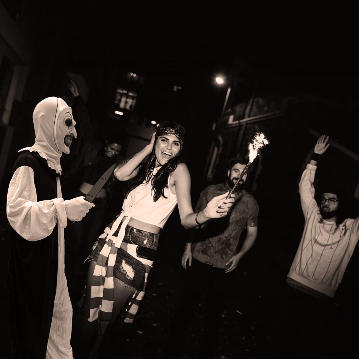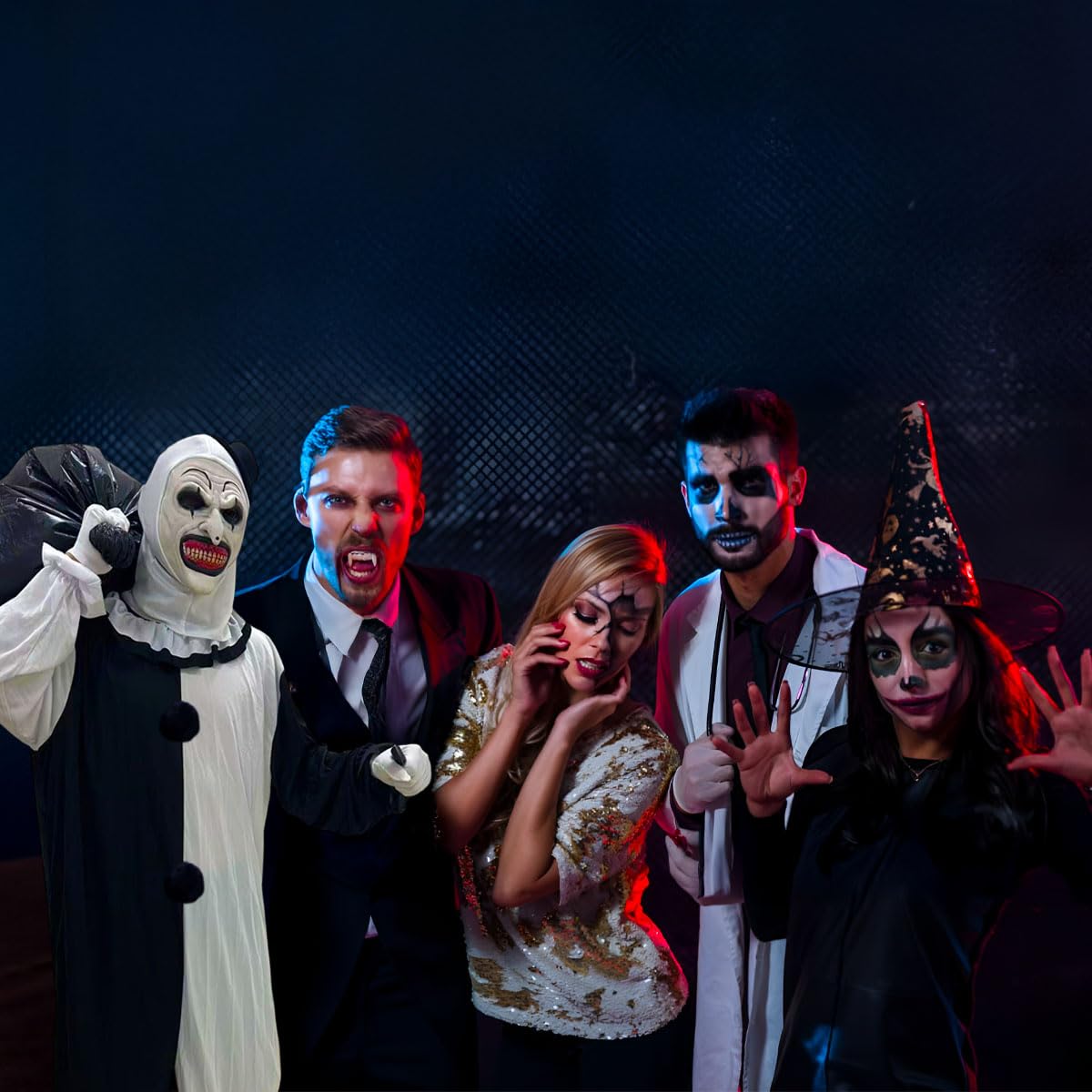 Inspirado en personajes de películas, el diseño realista del disfraz incluye disfraces de terror en blanco y negro y una máscara aterradora y sangrante, perfecta para interpretar al aterrador personaje.