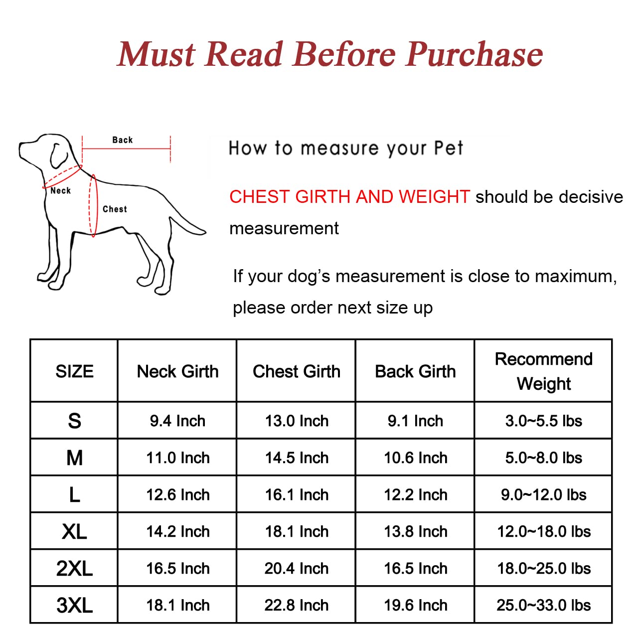 - Talla S: contorno de pecho de 13 pulgadas, contorno de cuello de 9.4 pulgadas, recomendado para 7.6 a 5.5 libras. Comprueba los detalles de las tallas claramente en la siguiente información de descripción antes de realizar el pedido.