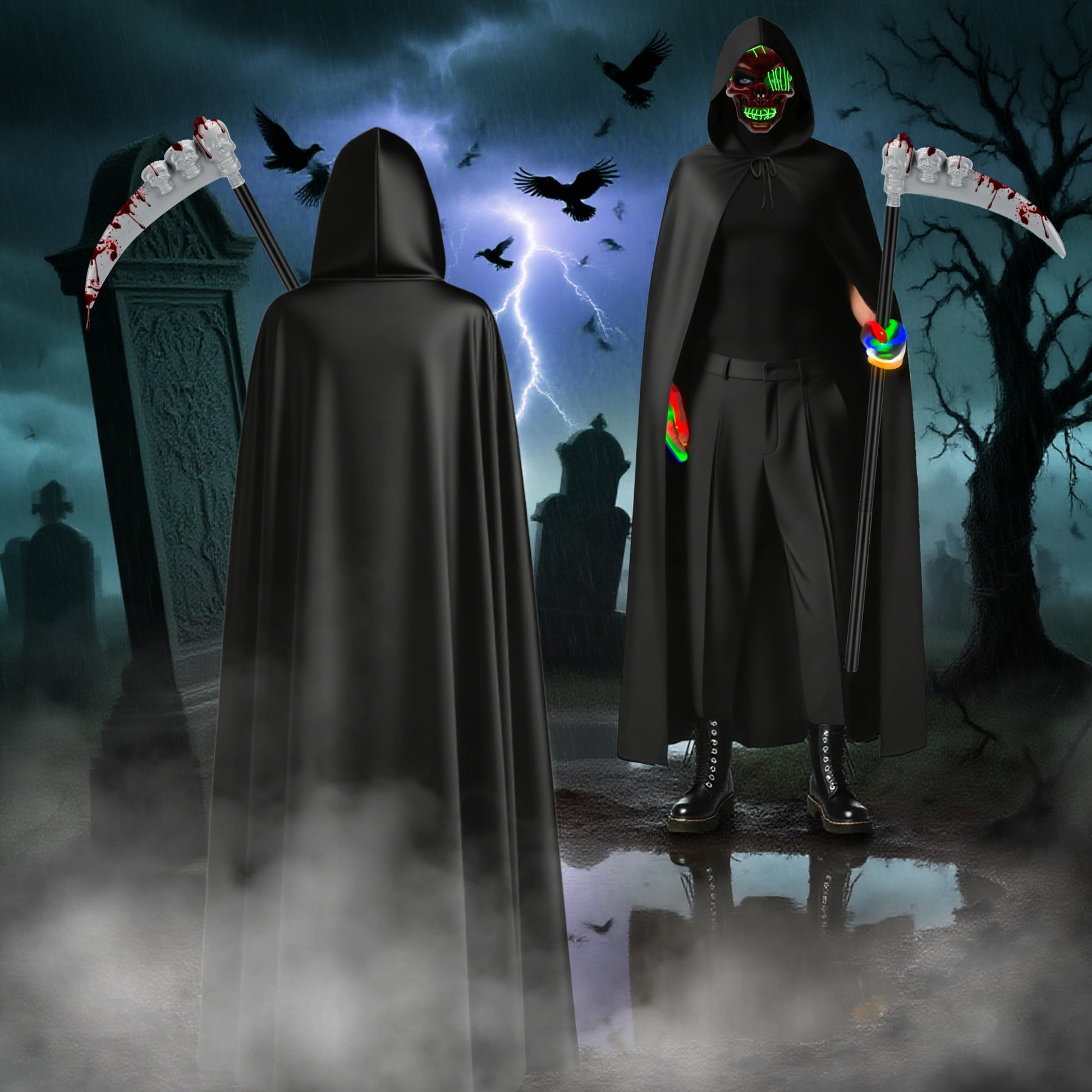 - Disfraz de Grim Reaper: Nuestro disfraz de muerte para adultos incluye 1 túnica de muerte con capucha, 1 máscara de calavera luminosa, 1 par de guantes luminosos y 1 guadaña de muerte. Nuestro conjunto de disfraz de la Muerte tiene un efecto misterioso y espeluznante: ¡perfecto para las oscuras noches de Halloween!