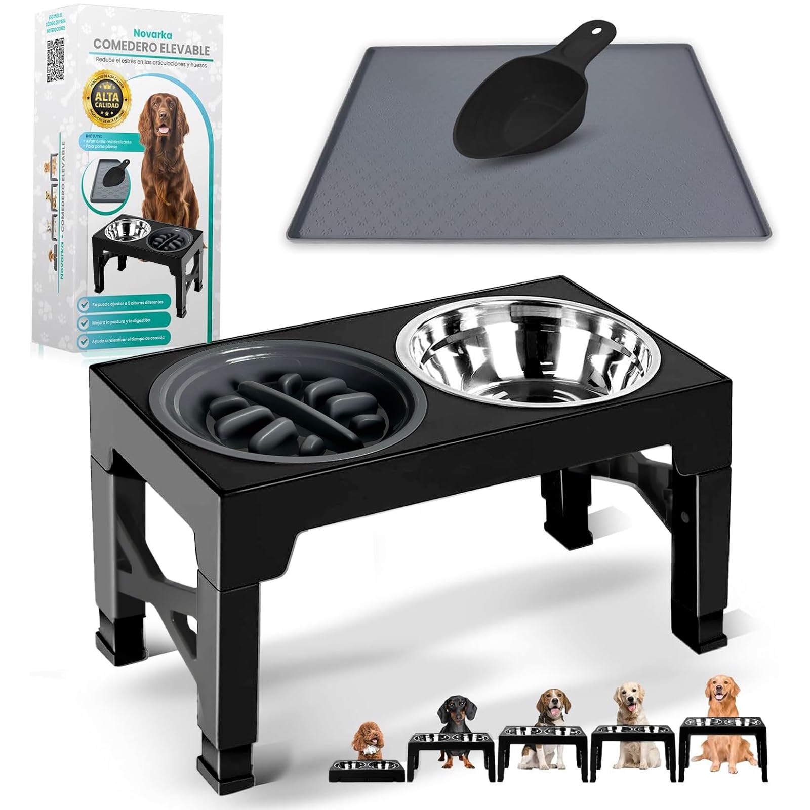 NOVARKA® Mega Comedero Perro Elevado con 5 Alturas | Incluye Bebedero de Acero Inoxidable y Comedero Perro Antivoracidad | Kit Premium Que Incluye Alfombra Antideslizante y Pala Carga Pienso