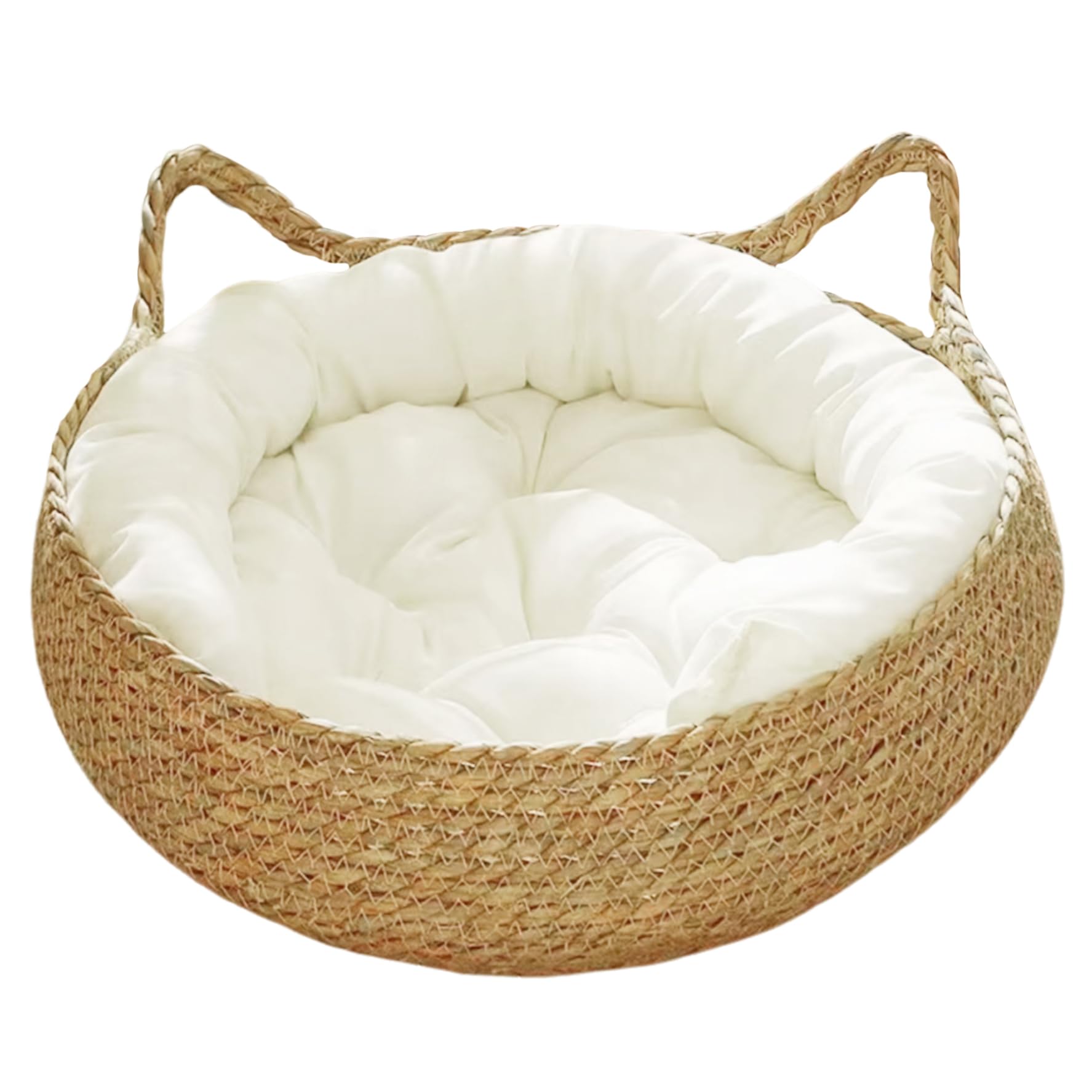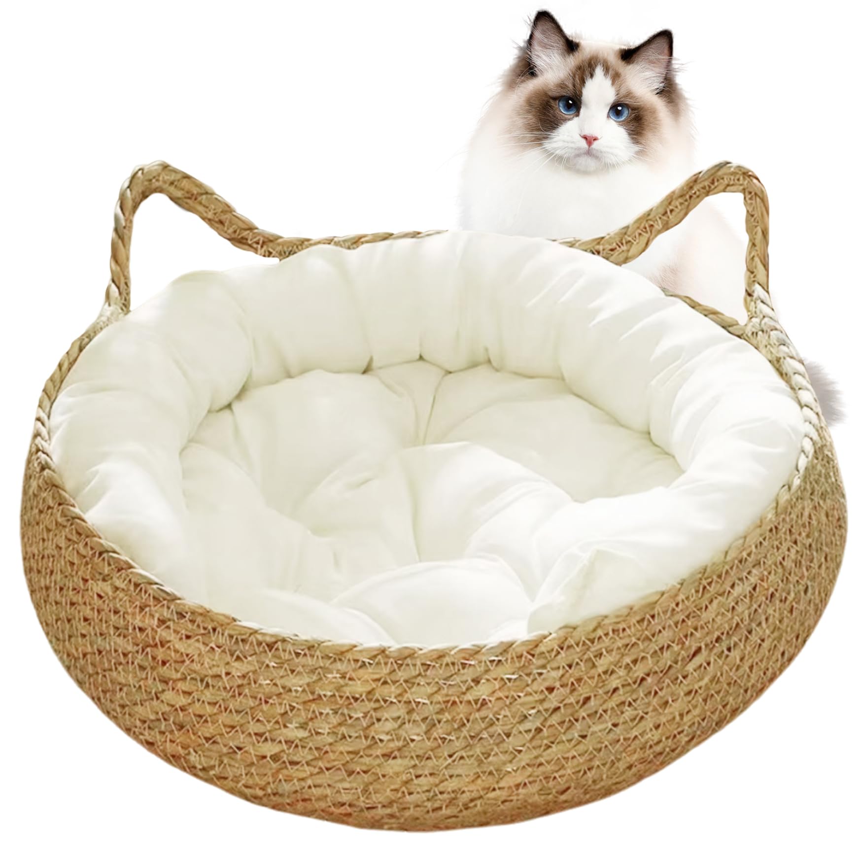 Cama de Gato, Cama de cestas de Gato Tejidas de 15 Pulgadas con cojín Suave, Nido de Cesta de Gato de Mimbre Redondo, Cama de Gatito Acogedor sin Deslizamiento para Gatos pequeños Perros