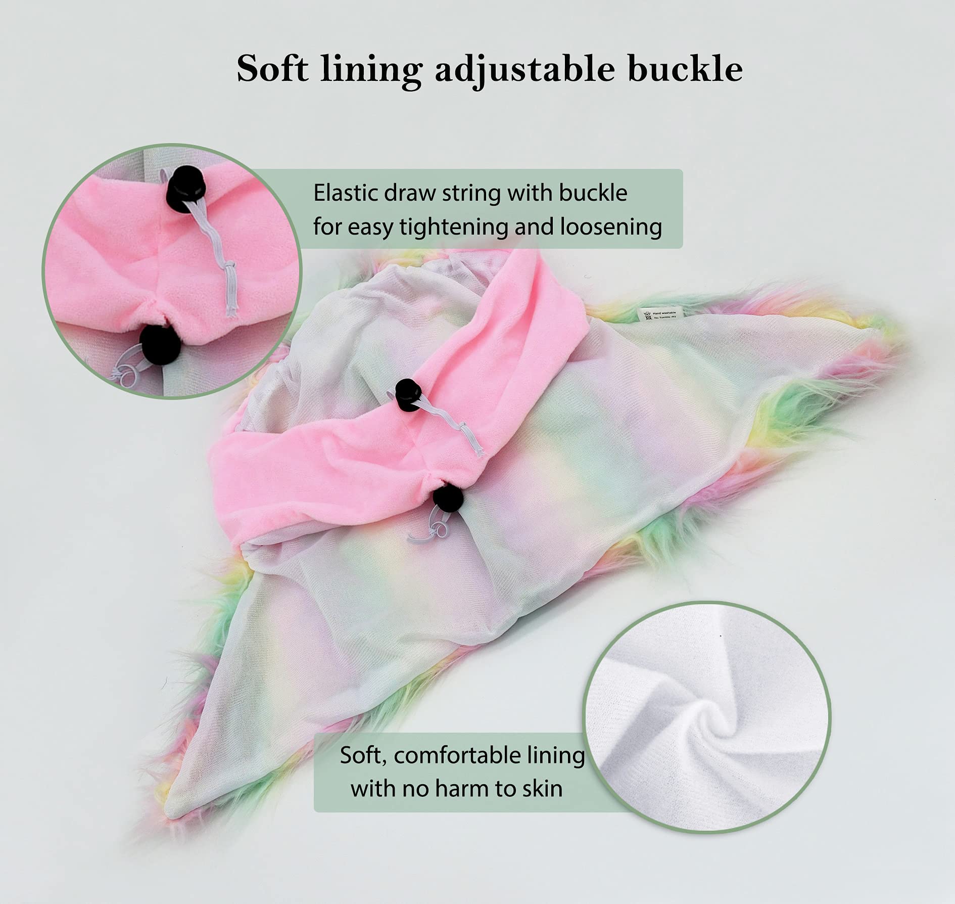 - Calidad decente y peso ligero: nuestro mejor amigo merece el mejor regalo para él. La melena está hecha de felpa larga suave de alta calidad que es ecológica y no libera colores. Es agradable de sentir con tacto suave no irritable para tu mascota.