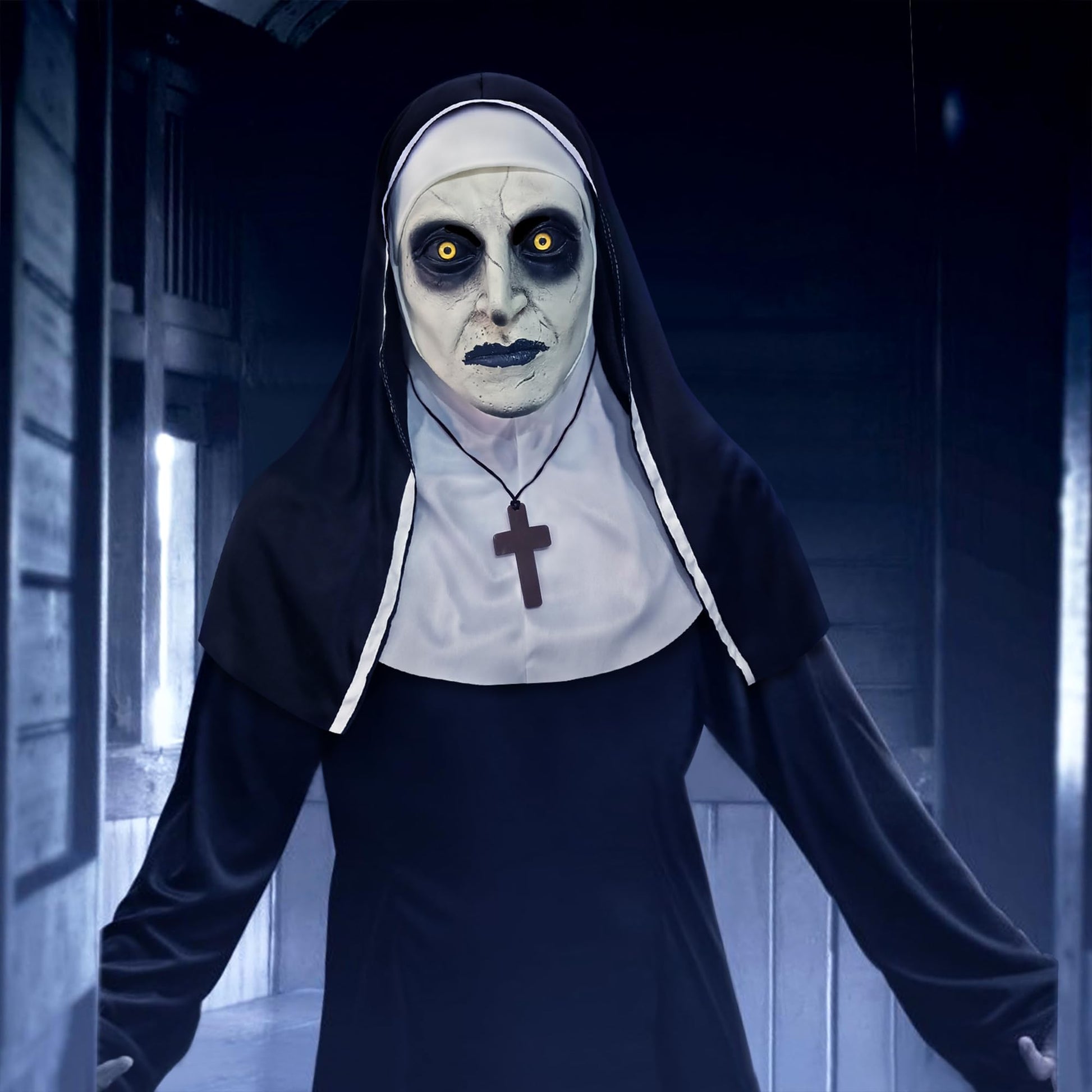 - Regalo perfecto: recibirás una máscara de monja y un collar con colgante de cruz, que definitivamente es una sorpresa de Halloween para mujeres y adultos. Se puede combinar con un disfraz de monja para mujer, disfraz de Halloween, te hace tener un Halloween memorable.