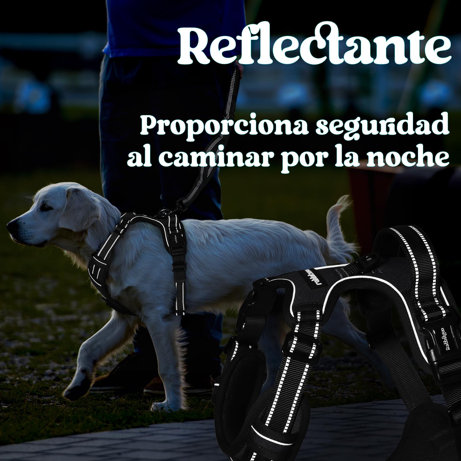 - Diseño Seguro: La hebilla de bloqueo en el cuello del arnes perro mediano asegura un ajuste firme y evita aperturas accidentales. Las tiras reflectantes anchas permiten que tu perro camine con seguridad en la oscuridad o de noche. Además, el asa superior ensanchada facilita el control de tu perro en situaciones de emergencia