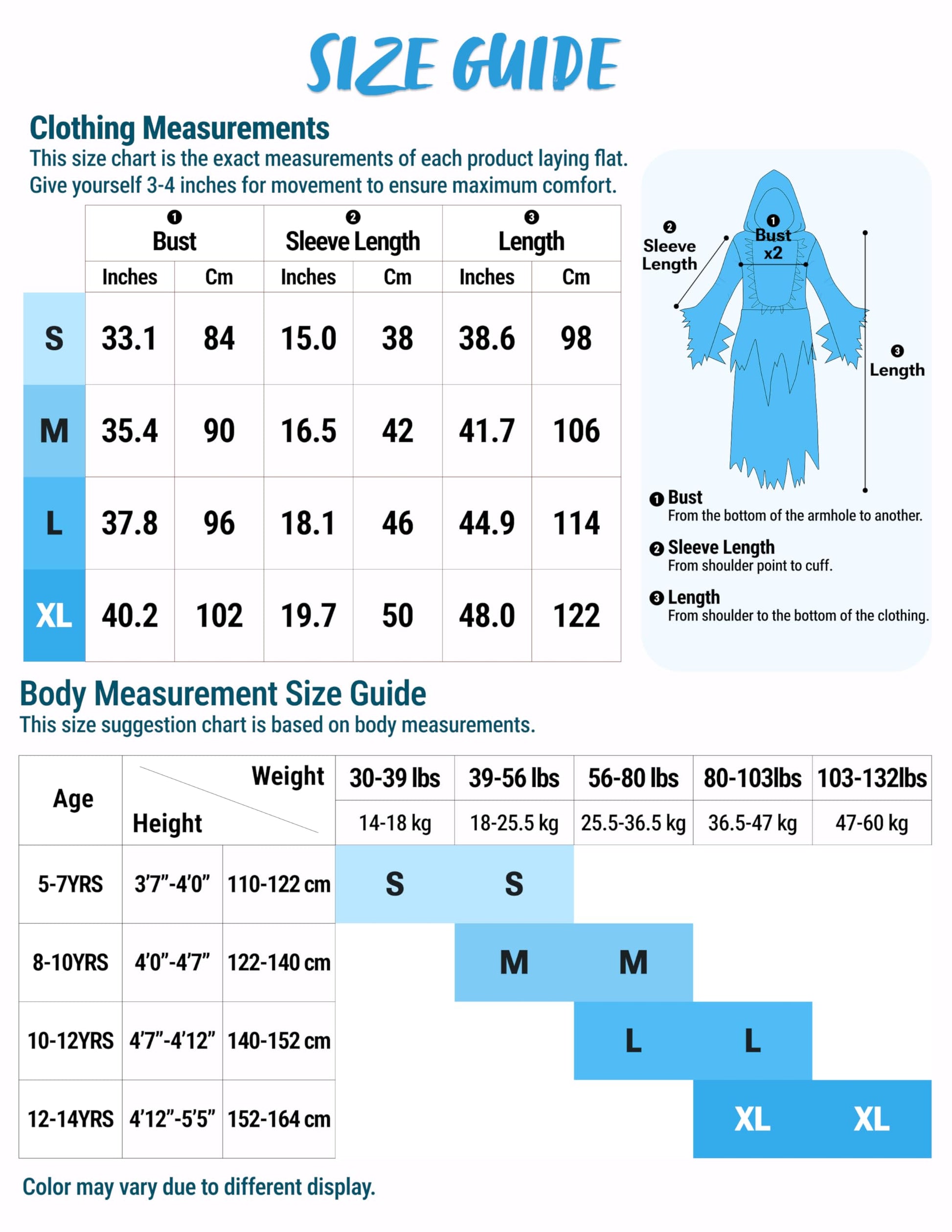 - Tamaño: Pequeño (5-7 años), Mediano (8-10 años), Grande (10-12 años), Extra grande (12-14 años).