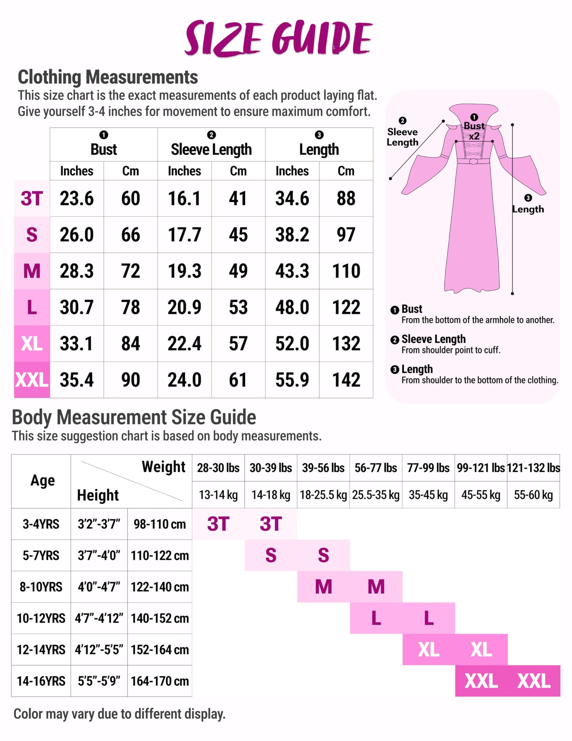 - Lavar a mano únicamente. Talla: Pequeño (5-7 años), Mediano (8-10 años), Grande (10-12 años) y X-Grande (12-14 años).
