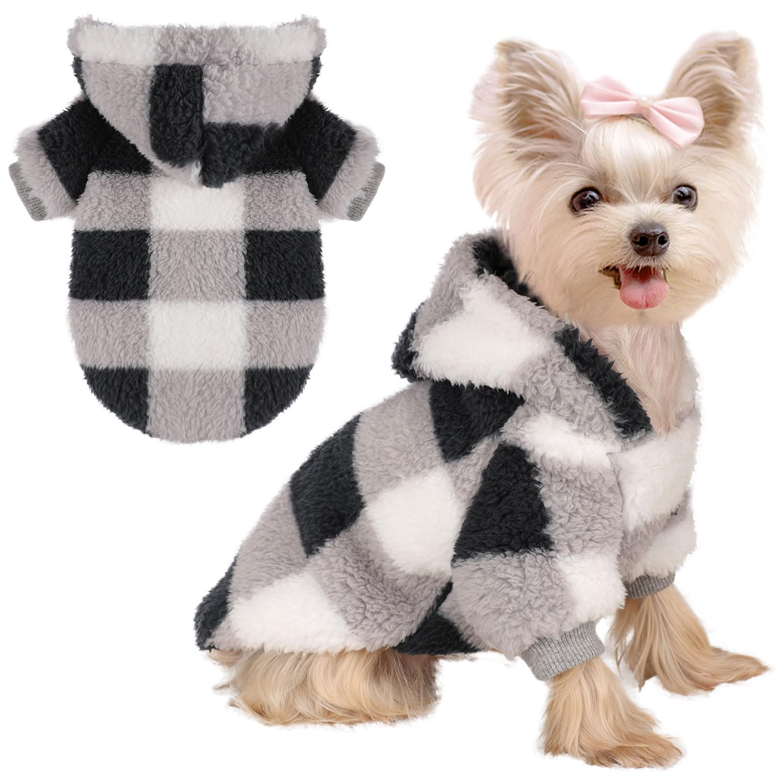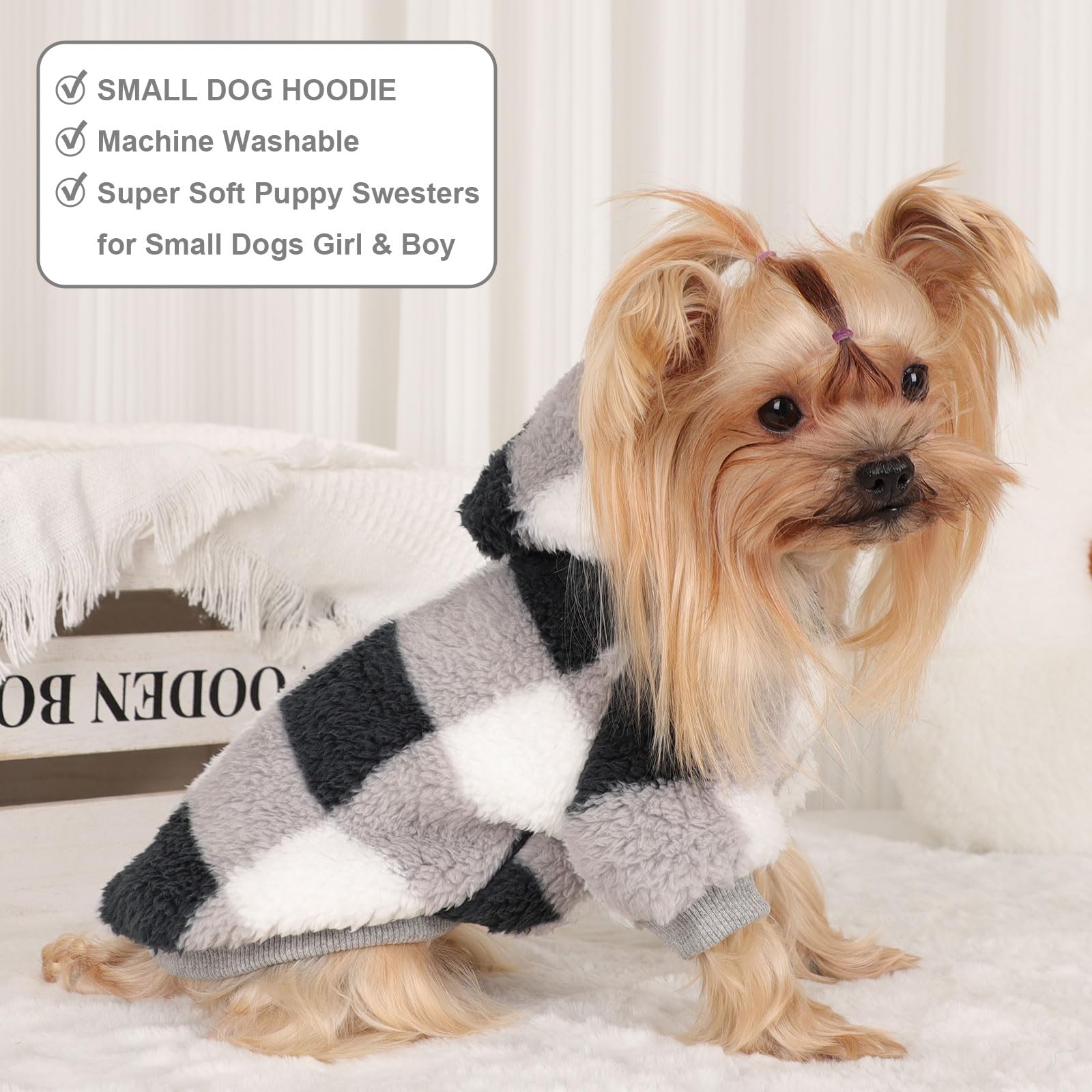 - Suéter para perros pequeños de estilo clásico: jersey para perro diseñado para perros pequeños, no apto para perros de tamaño mediano, perros grandes. Diseño clásico a cuadros en blanco y negro, estilo único de sudadera con capucha, muy adecuado para perros machos y hembras, perros y niñas. Nuestro suéter con capucha para perro solo es adecuado para razas de perros pequeños, como perros de taza de té, chihuahua y yorki. Diseño clásico de sudadera con capucha con diferentes patrones para todas tus pequeñas mascotas