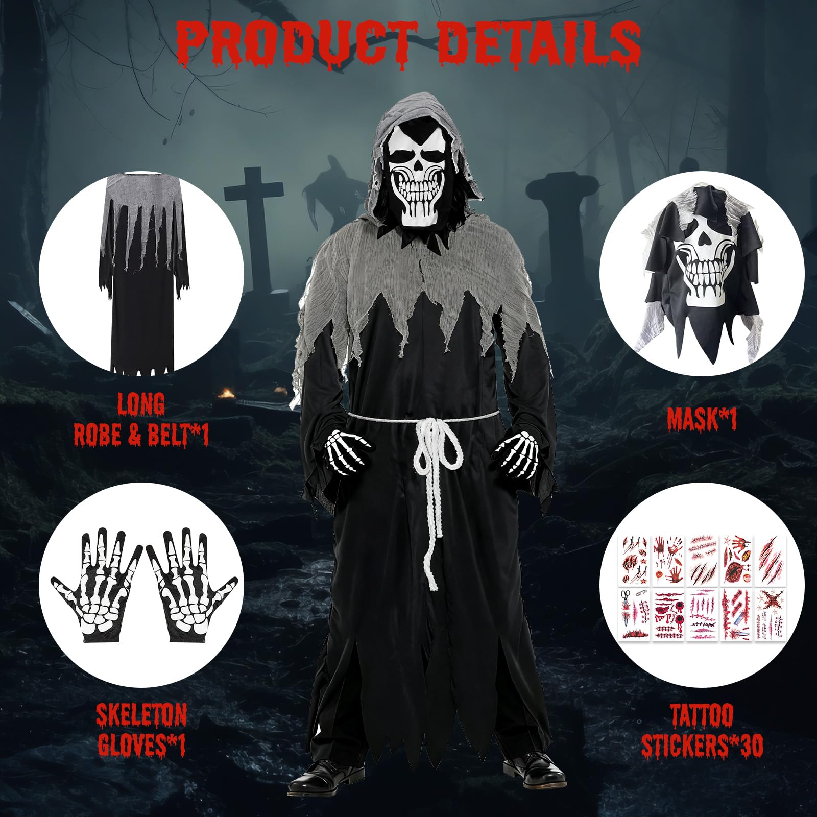 - 💀 Disfraz Halloween Completo para Adultos: Incluye 1 túnica, 1 máscara de calavera, 1 par de guantes, 1 cinturón ajustable (1.2m) y 30 pegatinas de tatuaje. Perfecto para disfraz halloween hombre adulto y disfraz halloween adulto mujer (Talla XL, 165-185cm). Ideal para fiestas de Halloween o eventos terroríficos