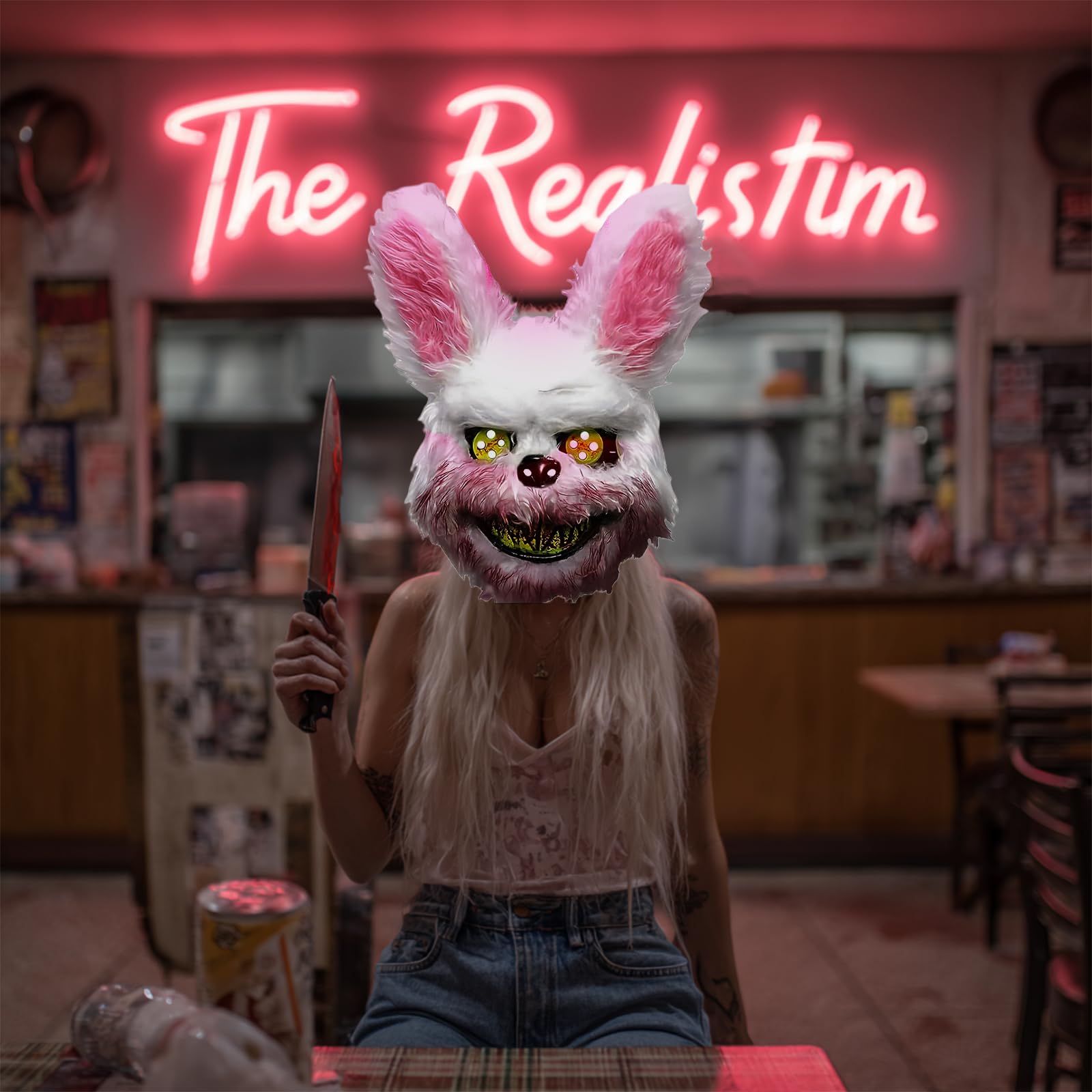- 🐰👺【MATERIAL】Máscara de conejo de terror Hecho de plástico y piel falsa, que es seguro y no tóxico, resistente y duradero, Boca sangrienta, ojos de diablo, felpa blanca, Miedo a primera vista, Y luego lindo después de un tiempo, Máscara interesante, Cuchillos de imitación también están hechos de plástico, Muy realista, grandes accesorios para máscaras.