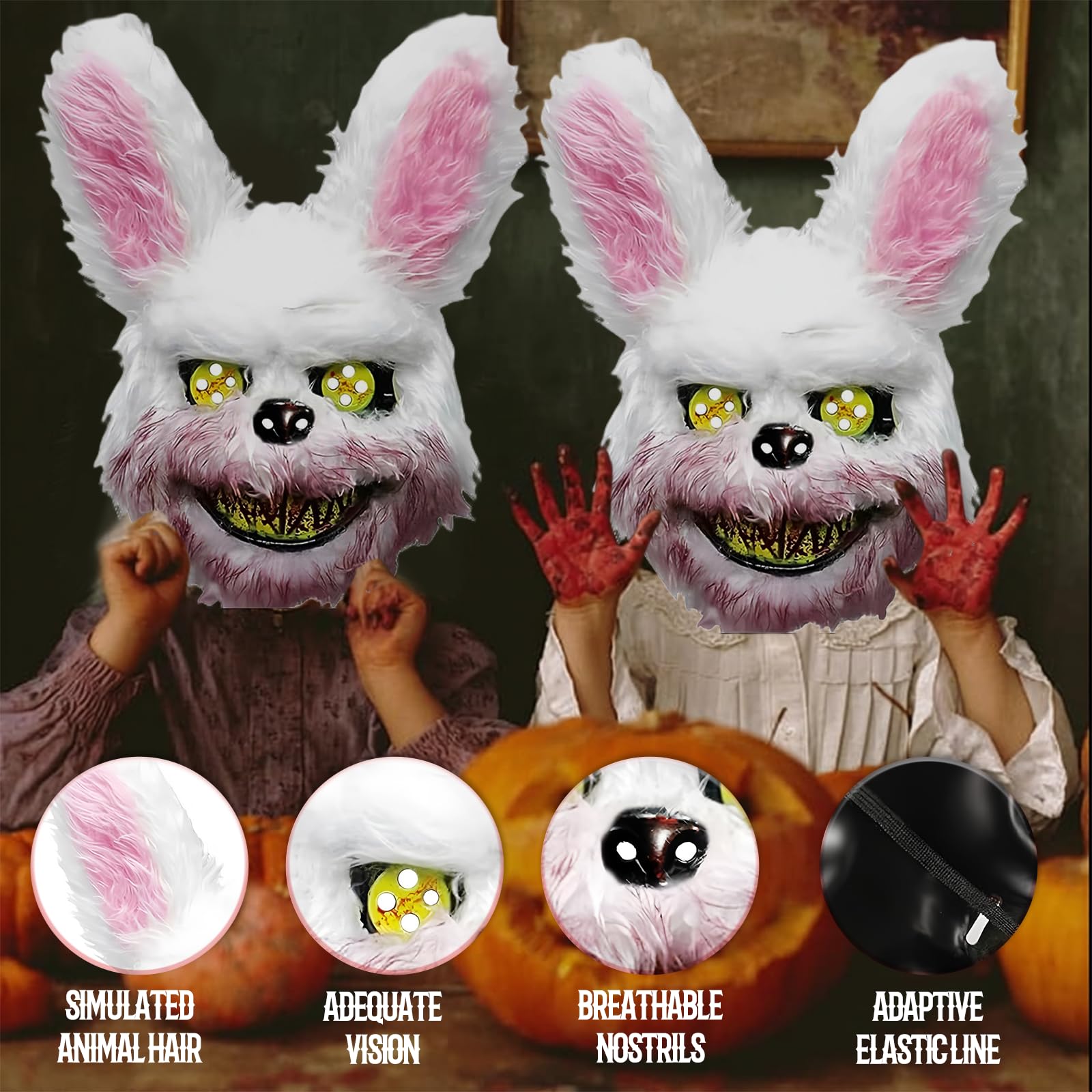 - 🐰👺【CÓMODO DE LLEVAR】Máscara de conejo Gracias al diseño hueco de los ojos y las fosas nasales, ¡respirar es muy cómodo con esta divertida máscara de Halloween! La máscara tiene una correa elástica ajustable, talla única.