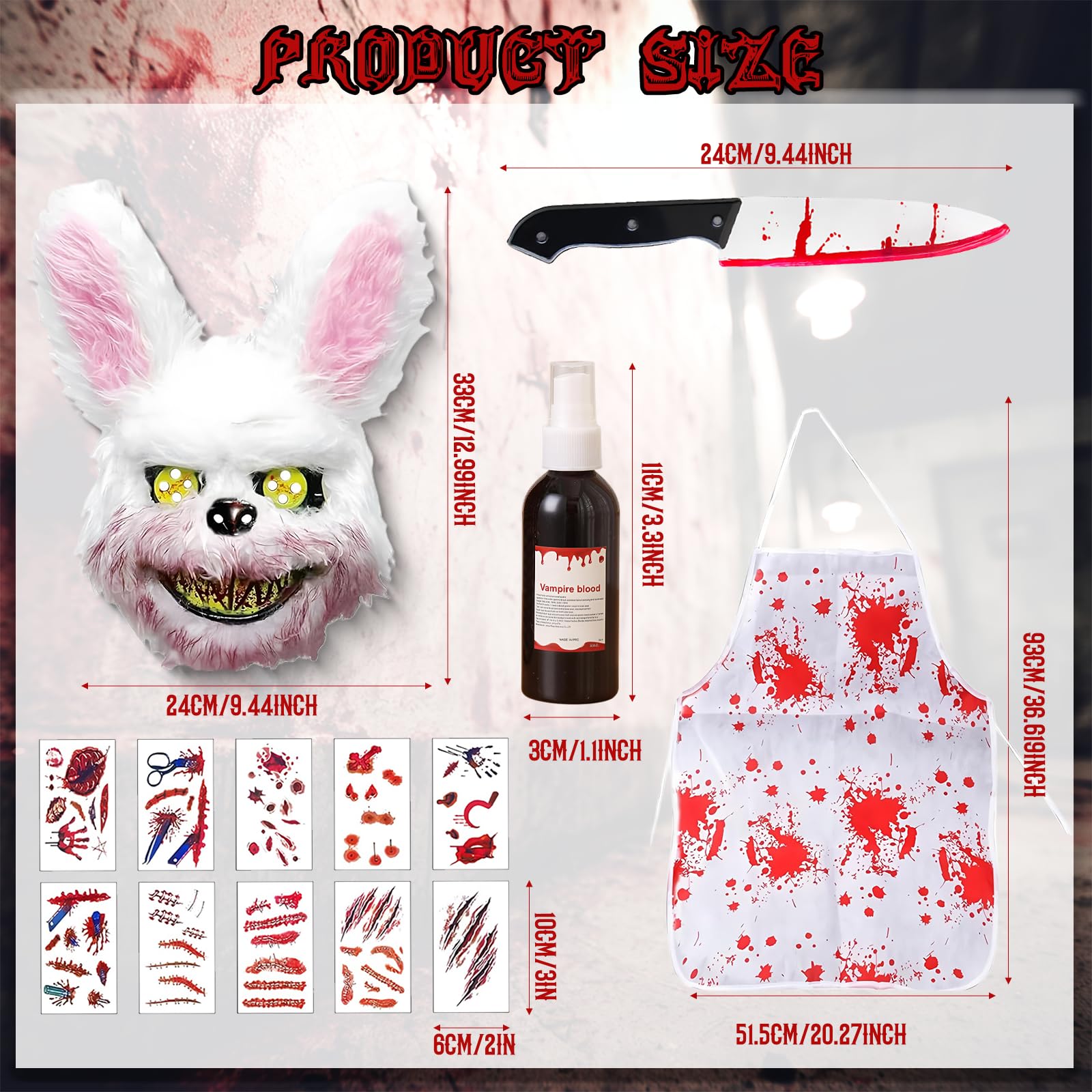 - 🐰👺【Accesorios sangrientos realistas】Contiene La máscara de Halloween de conejo aterrador, guantes blancos, sangre artificial, hojas de tatuaje temporal, delantal ensangrentado y machete ensangrentado. Este creativo conejo del terror disfraces combina la máscara de conejo y elementos sangrientos para crear una apariencia linda y aterradora de Halloween. Este conejo del terror disfraces es perfecto para cosplay en la fiesta de Halloween.
