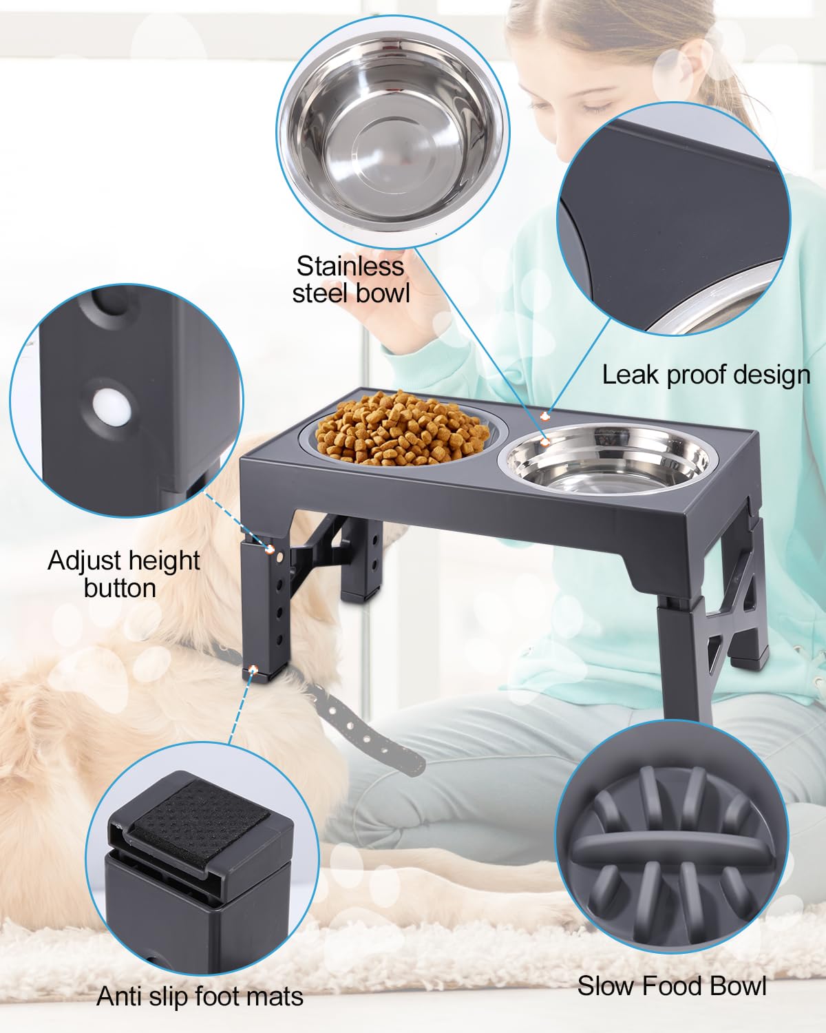 - Proteja la salud de su perro: El diseño de altura ajustable ayuda a reducir el estrés en las articulaciones y los huesos, mejora la postura y la comodidad de su perro y promueve una digestión saludable. Puede ralentizar la velocidad de alimentación del perro, evitar comer demasiado rápido y afectar la digestión del perro, y ayudar a su perro a desarrollar buenos hábitos.