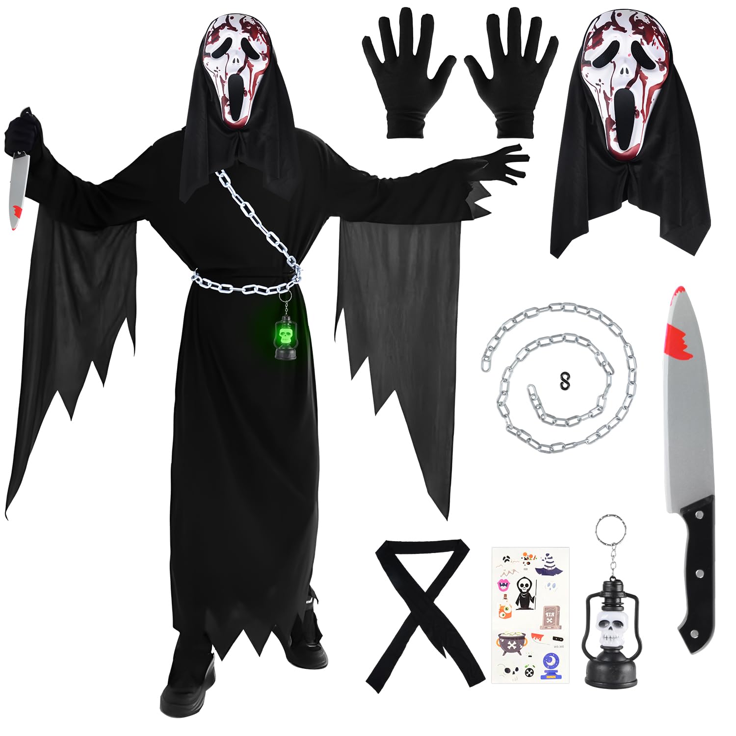Disfraz Scream para Niños Halloween Scream Costume con Máscara Ghostface y Cuchillo de Juguete Sangriento, Disfraces Halloween de la Película de Terror (100)