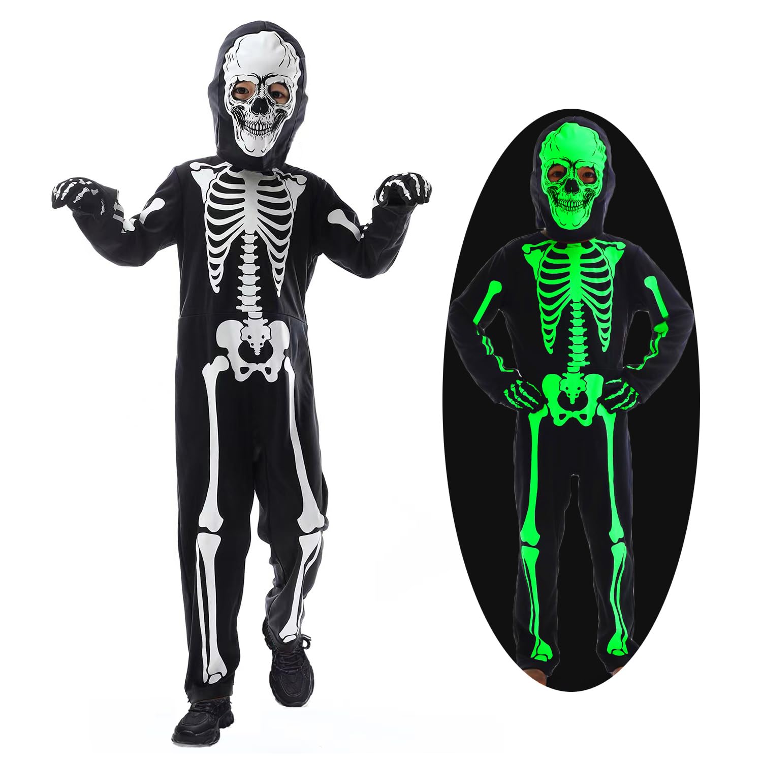 - 【Disfraz de Esqueleto para Niños】El Conjunto de Disfraz de Esqueleto incluye un casco con dibujo de cara, un mono para niños y guantes con huesos. La parte trasera tiene un diseño de hebilla adhesiva, que permite al niño ponerse y quitarse fácilmente el body.
