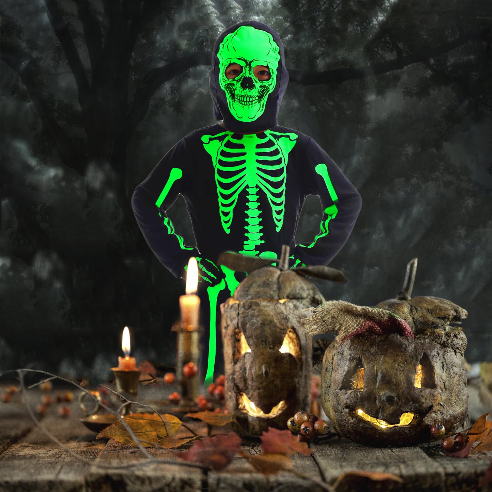 - 【Scary Costume for Kids】Disfraz de esqueleto que brilla en la oscuridad, rechaza la monotonía y rechaza la mediocridad. En el festival o fiesta, usted es el más fresco entre los muchos niños en trajes de esqueleto similares. Antes de vestir el traje de esqueleto, es mejor utilizar una luz fuerte para iluminar el lado luminoso del traje de esqueleto por un tiempo, el largo tiempo para iluminar y el brillo funcionará más mejor.