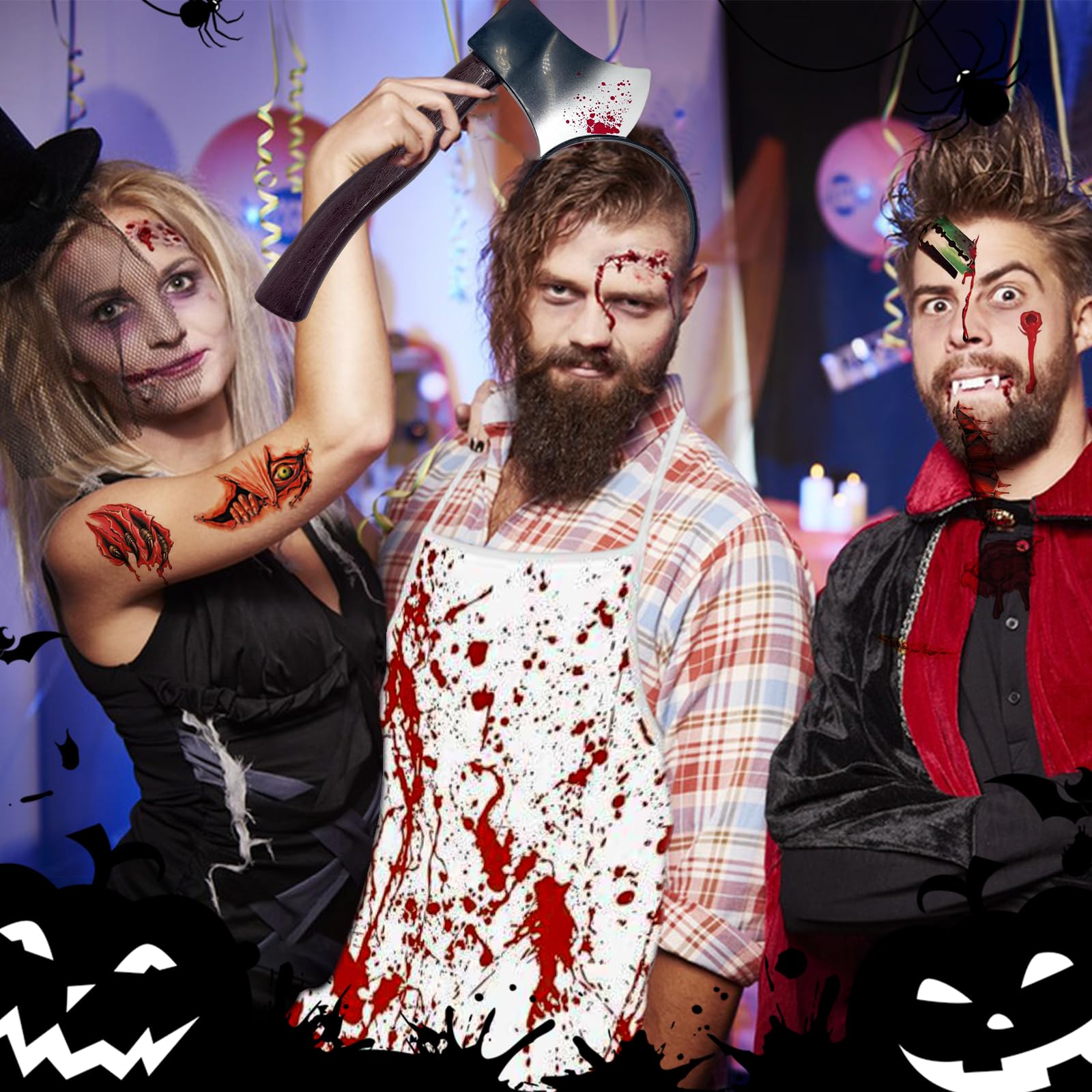 - 【Mejora la atmósfera】】El delantal salpicado de sangre parece increíblemente realista, creando un efecto aterrador que provoca un impacto visual y hace que quienes te rodean sientan miedo y pánico; las manchas de sangre realistas hacen que el disfraz resulte extremadamente aterrador. Los tatuajes de cicatrices crean un efecto de herida real, lo que te da un aspecto impactante. Cuando comience la fiesta, este disfraz atraerá mucha atención.