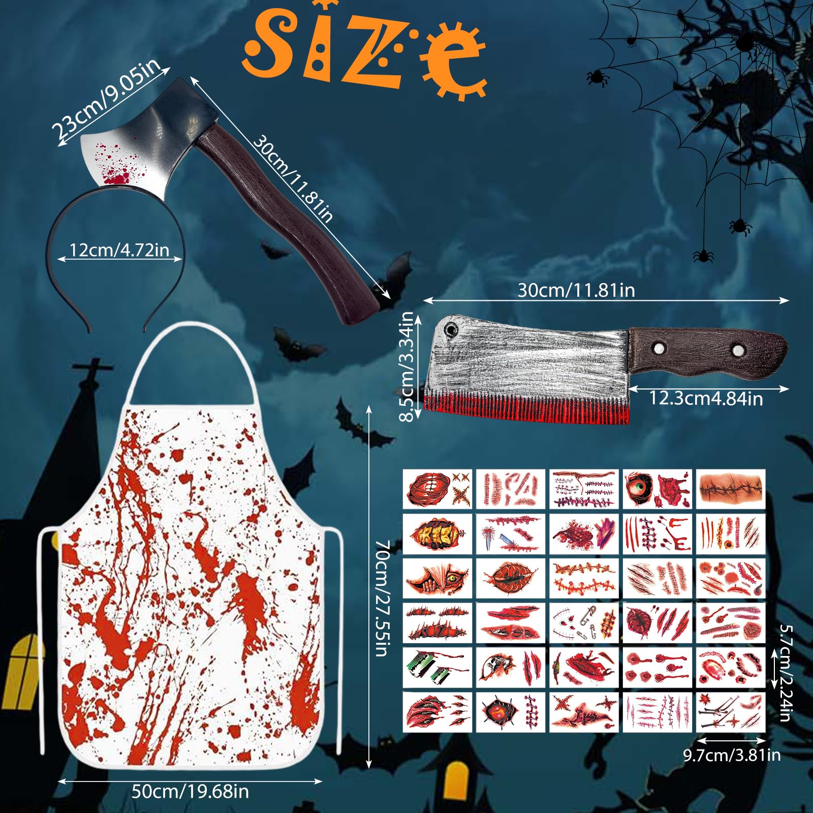 - 【Materiales de Alta Calidad】El delantal manchado de sangre está fabricado con fibra de poliéster, lo que lo hace cómodo, suave, agradable al tacto y transpirable. El cuchillo y el hacha manchados de sangre de Halloween están fabricados en plástico con una superficie lisa, por lo que no suponen ningún riesgo de lesión. Los tatuajes de cicatrices son divertidos, transpirables y tienen un aspecto muy realista y natural.