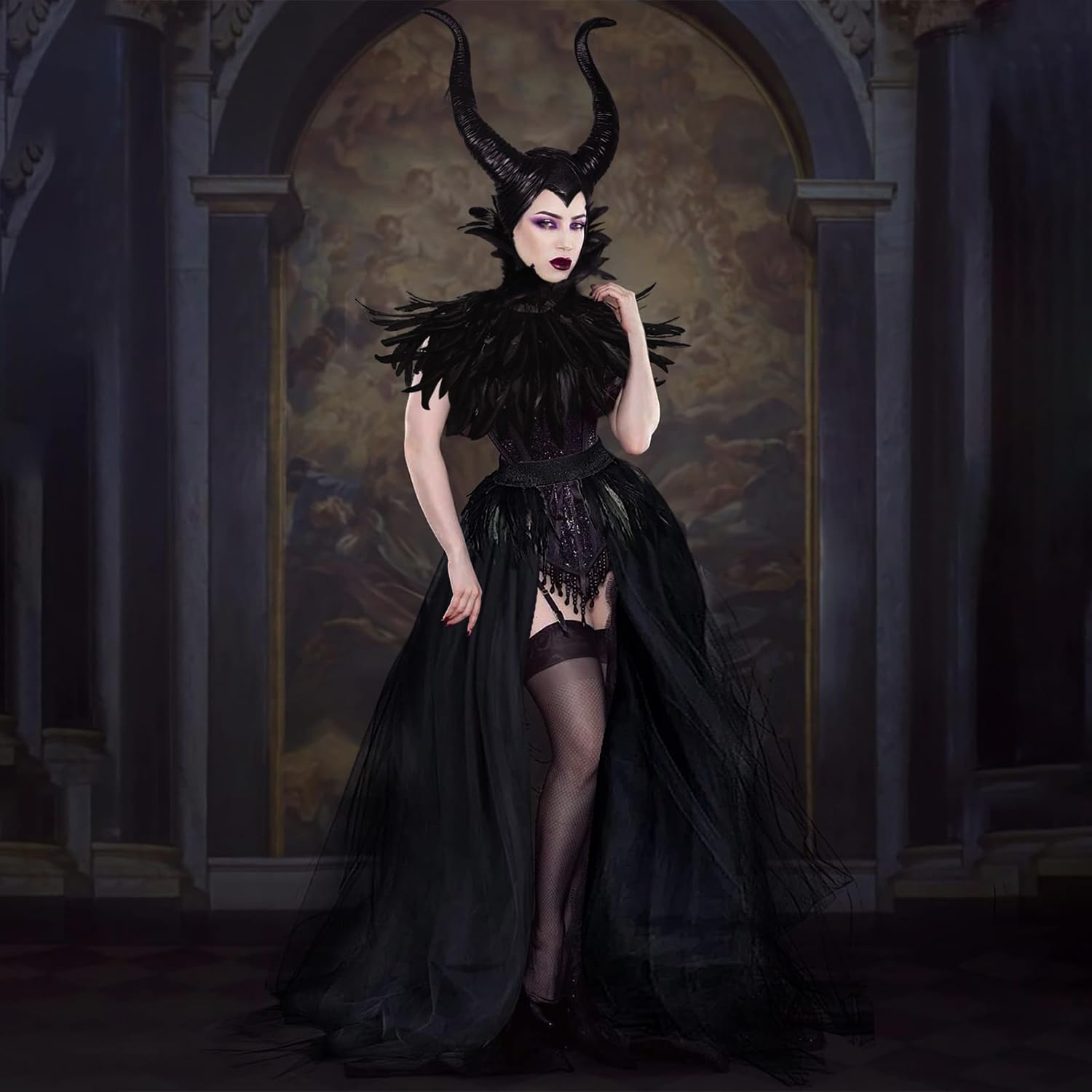 - Acabado de alta calidad: los cuernos elásticos de Maléfica se adaptan a la mayoría de los tamaños de cabeza. El pañuelo de plumas de cuervo se fija con correas, por lo que no tendrás que preocuparte por ajustarlo a tu cintura y conseguirás la mejor transformación.